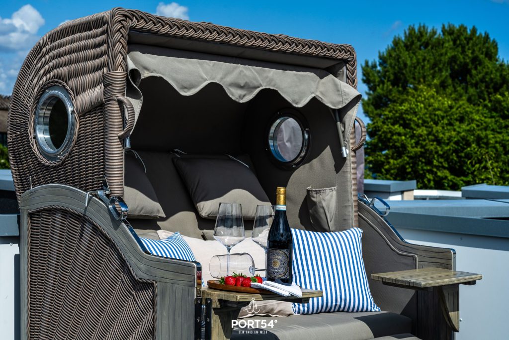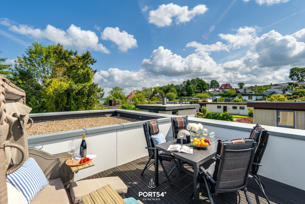 Genieße vom Strandkorb auf der großzügigen Dachterrasse die Sonnenuntergänge und einen herrlichen Panorama-Meerblick über die Flensburger Außenförde bis nach Dänemark.