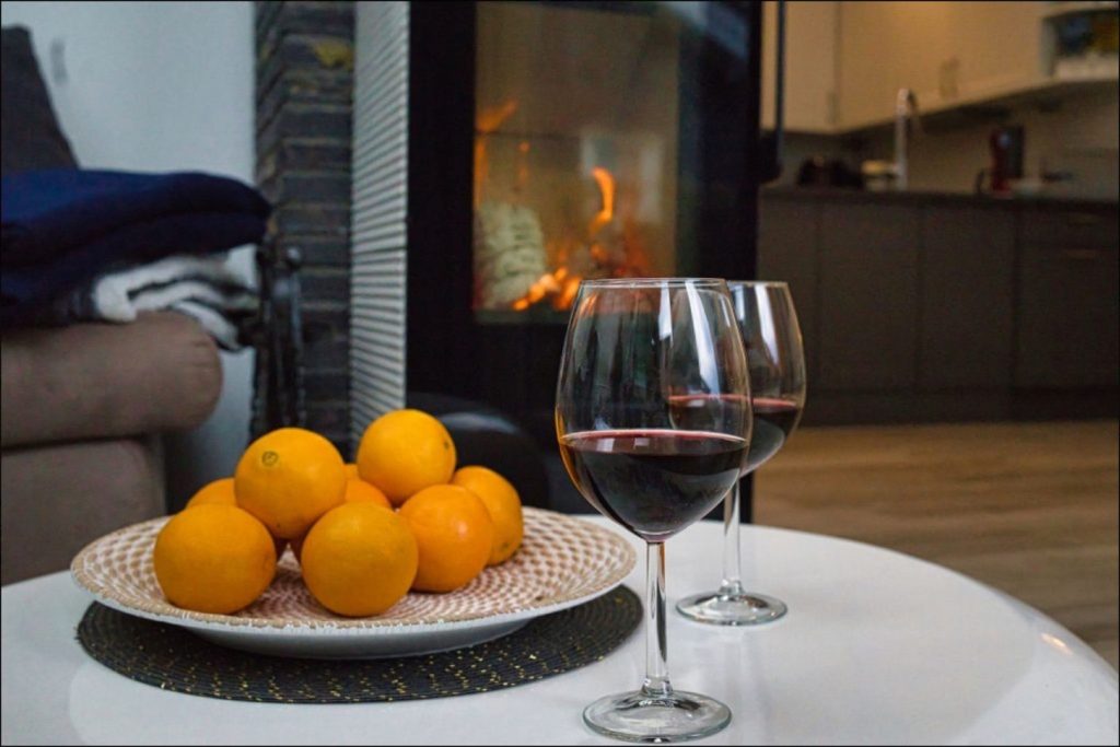 Im Wohnzimmer lädt eine gemütliche Couch zu entspannten Abenden am Kaminofen ein.