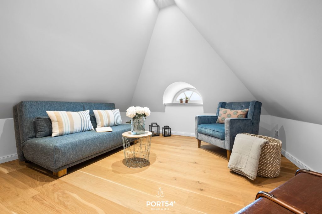 Vom ersten Obergeschoss erreichst Du die Galerie im zweiten Obergeschoss, wo ein gemütlicher Rückzugsort mit Schleiblick geschaffen wurde.