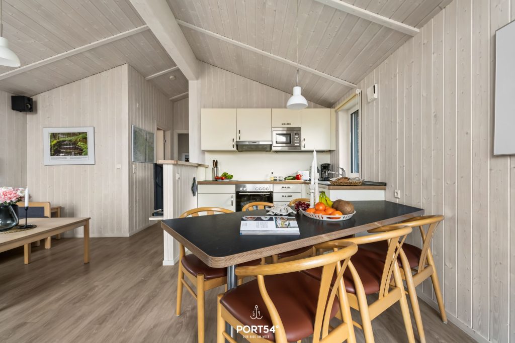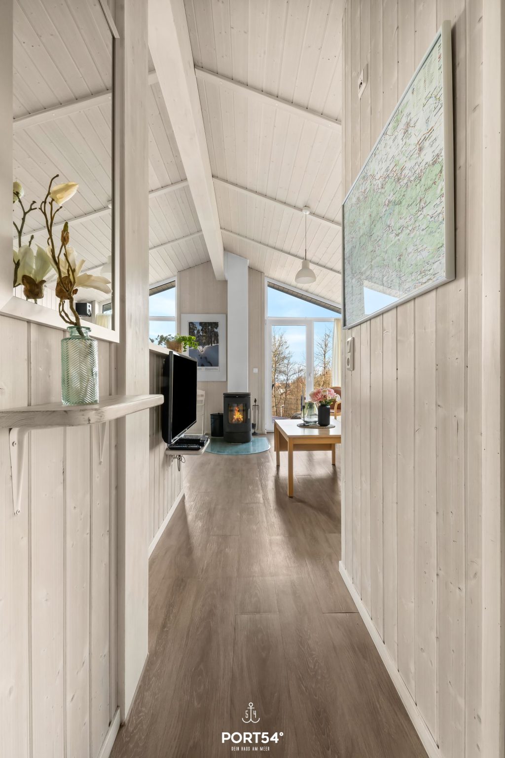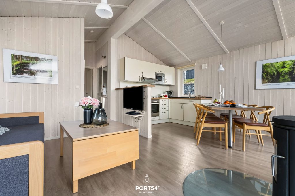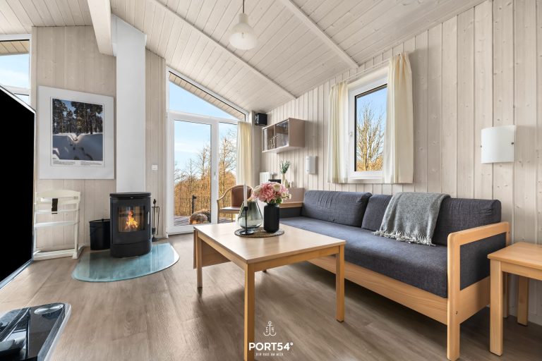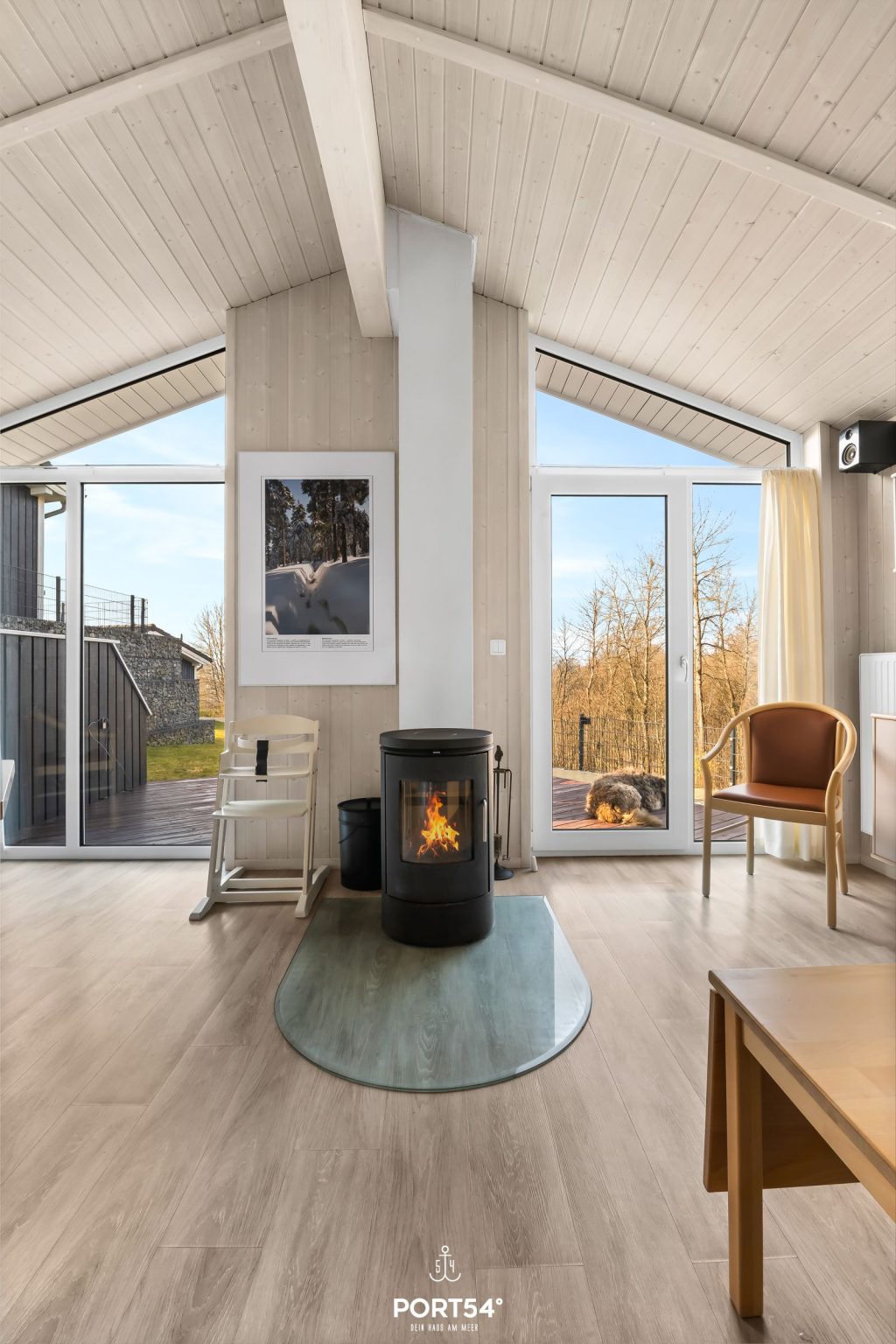 Der offene Wohnbereich ist das Herz des Hauses. Eine gemütliche Couch, rustikale Holzelemente und ein Holzofenkamin sorgen für eine behagliche Atmosphäre, die zum Entspannen einlädt. Große Fenster lassen viel Tageslicht herein und bieten dir einen malerischen Blick auf die umliegende Natur. Zur Unterhaltung stehen ein Flachbild-TV und eine Musikanlage bereit.