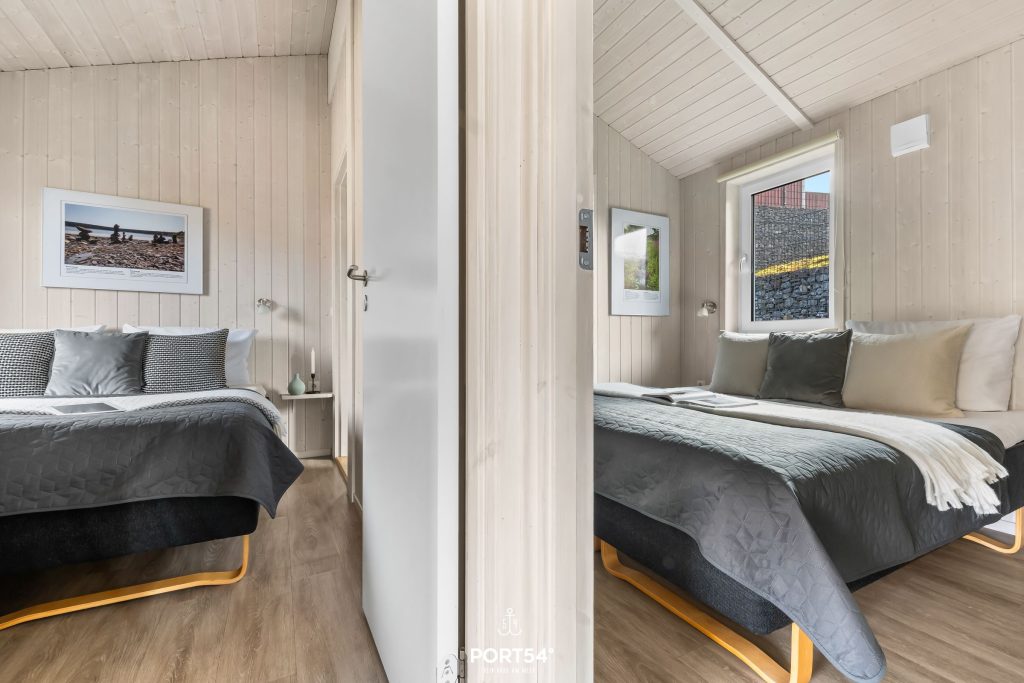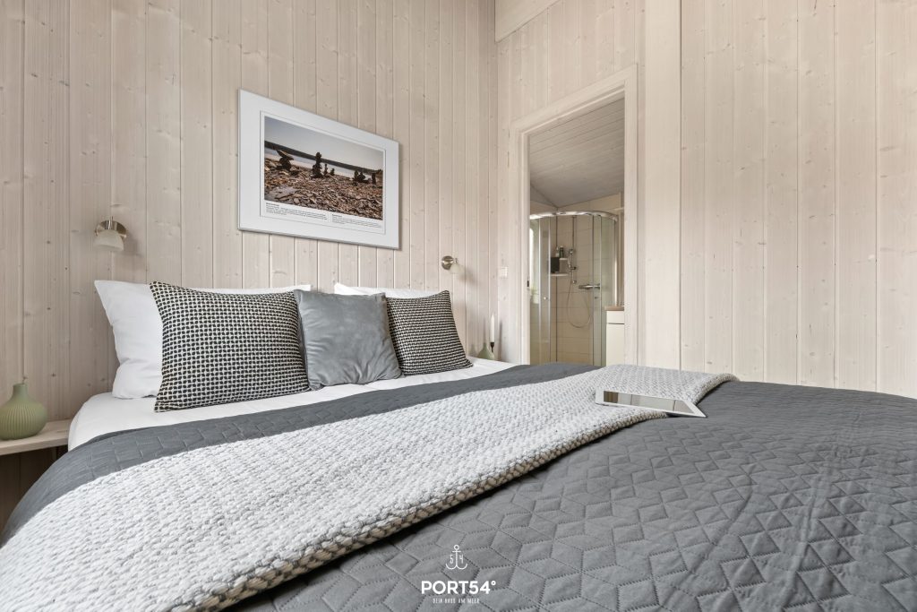 Das Ferienhaus verfügt über zwei Schlafzimmer, die jeweils mit zwei zusammengeschobenen Einzelbetten (zusammen 160 x 200 cm) ausgestattet sind. Die ruhige und naturnahe Farbgestaltung schafft eine angenehme, entspannte Atmosphäre für erholsame Nächte. Im Wohnzimmer findest du eine ausziehbare Schlafcouch (140 x 190 cm), die Platz für zwei weitere Personen bietet – ideal für Kinder oder Freunde. Bettwäsche und Handtücher können optional hinzu gebucht werden.