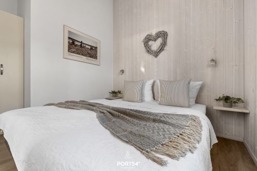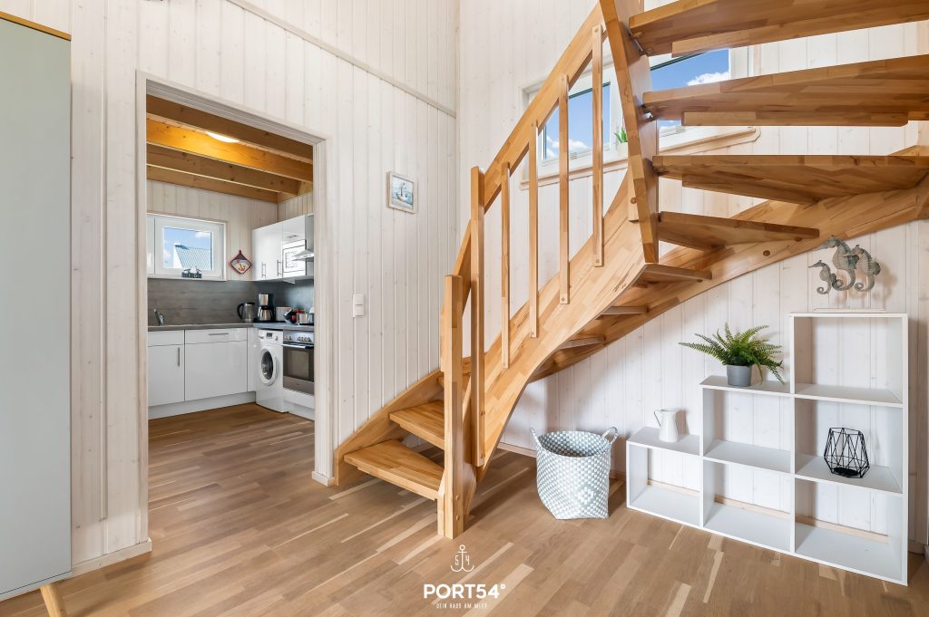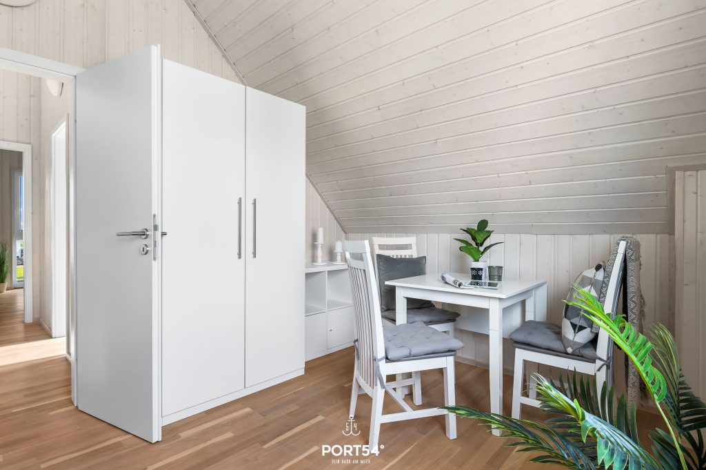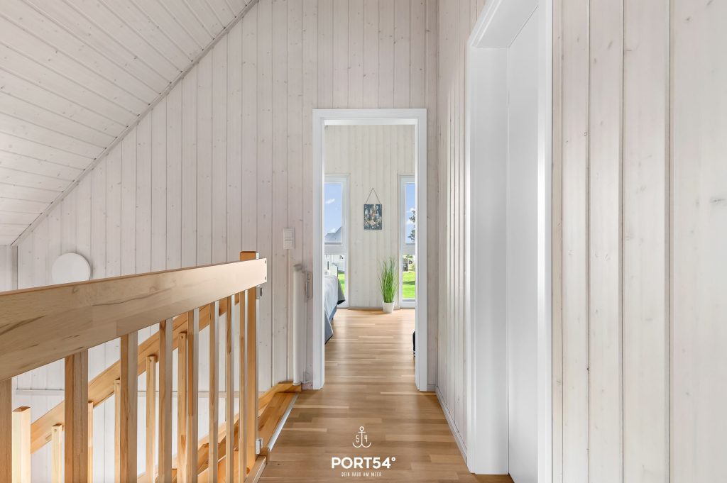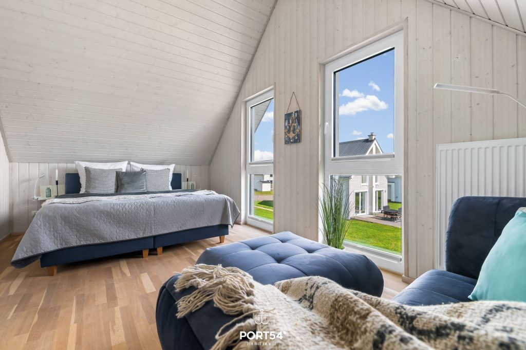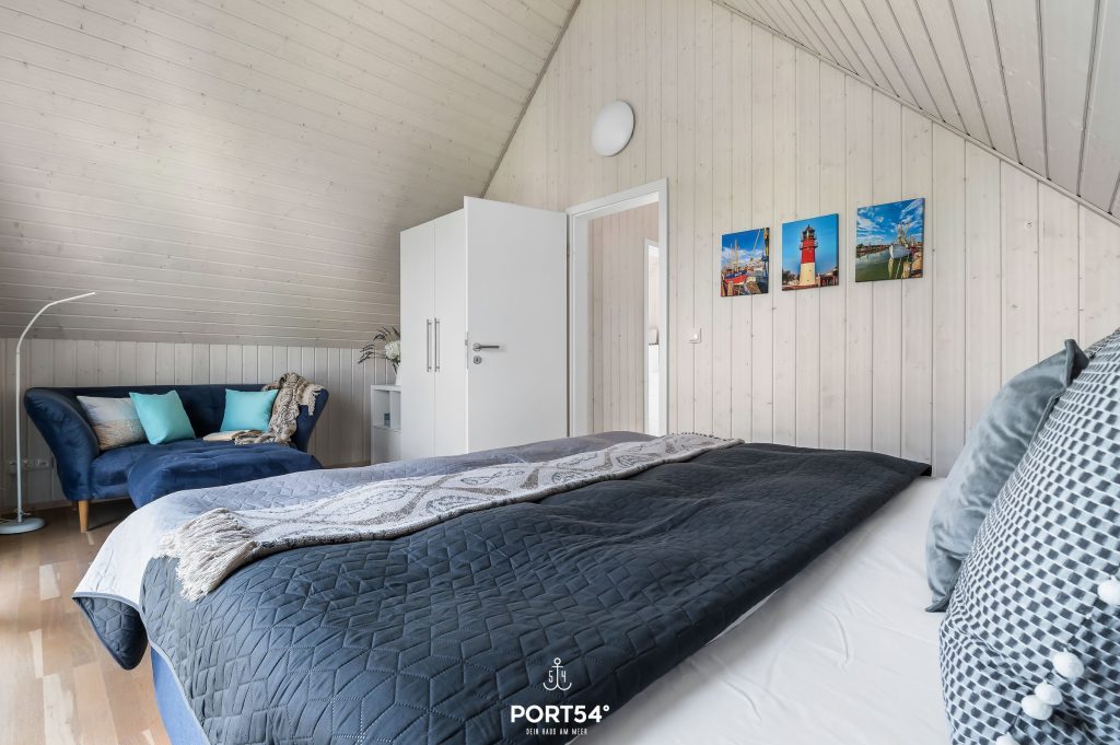 Im Obergeschoss befinden sich zwei Schlafzimmer. Eines der beiden Zimmer bietet ein gemütliches Boxspringbett (180x200 cm), das zweite Schlafzimmer ist mit zwei Einzel-Boxspringbetten (je 90x200 cm) ausgestattet. Beide Zimmer verfügen über Verdunkelungsmöglichkeiten und Insektenschutz sowie je einen Schrank, sodass einem erholsamen Schlaf nichts mehr im Wege steht.