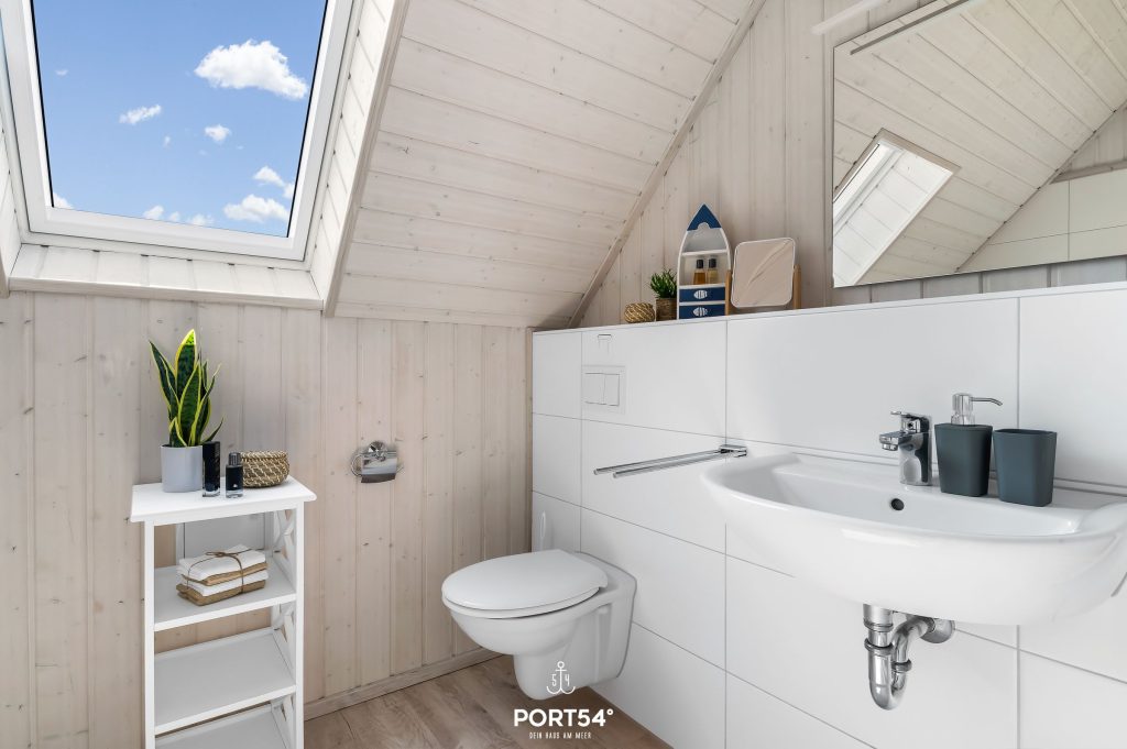 Das Bad im Obergeschoss bietet ein Dachfenster mit Sichtschutz, eine Badewanne, eine Handtuchheizung, einen Föhn und ein weiteres WC.