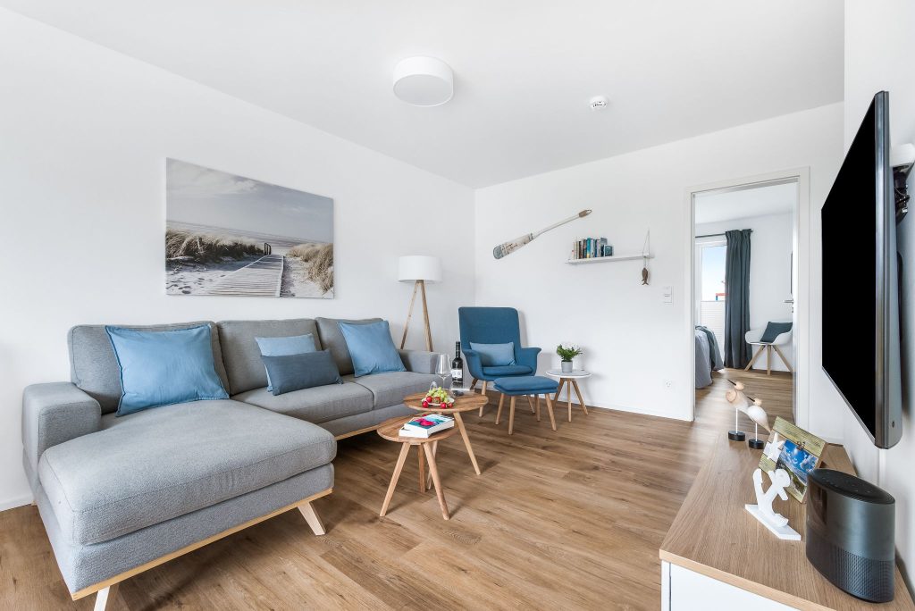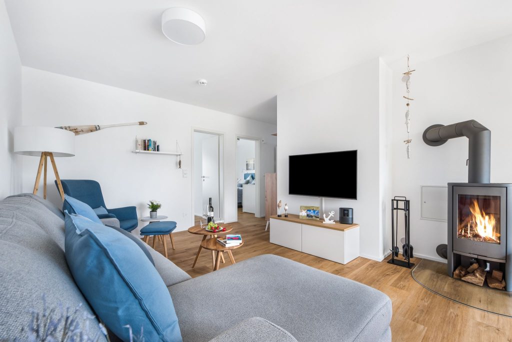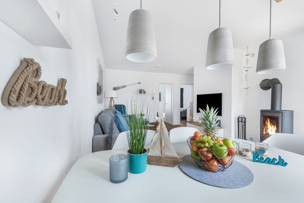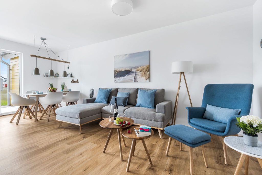 Der offene Wohn- und Essbereich ist dank der bodentiefen Fenster hell und freundlich, während die geschmackvolle Einrichtung zu einer Wohlfühlatmosphäre beiträgt.