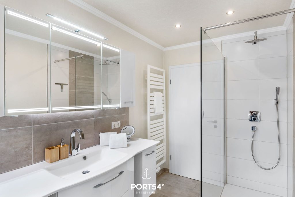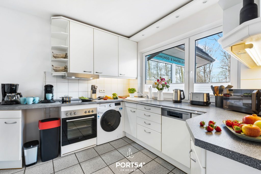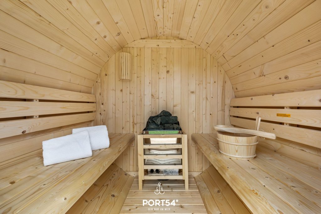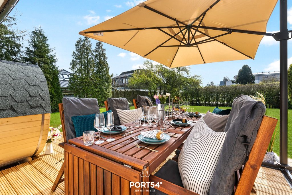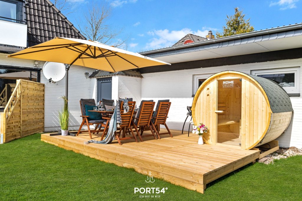 Die Unterkunft ist in der Nähe der Supermärkten und der leckere Mühle Bäckerei. In der Beschreibung steht Waschmaschine, aber es ist ein Waschtrockner, was auch sehr gut funktioniert hat. Das Bad fanden wir schön. Große Dusche und eine Badewanne. Man muss zwar raus um in Garten und Sauna zu kommen, aber das lohnt sich. Die Sauna ist top, ist in ein paar Minuten schon aufgeheizt. Und danach im Garten verweilen.