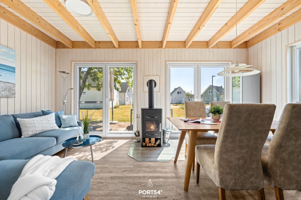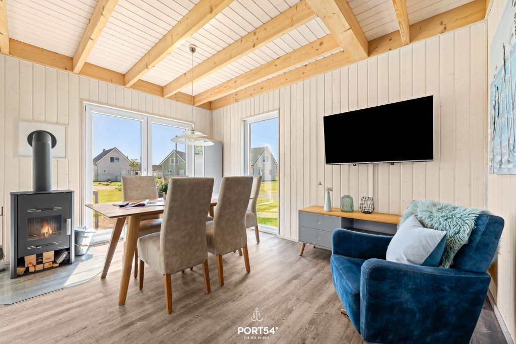 Bereits bei Eintritt verspürst Du die Gemütlichkeit Deines Ferienhauses. Hier besticht nicht nur die hochwertige Einrichtung, sondern auch als weiteres Highlight ein Kamin im Wohnzimmer, der eine wohlige Wärme ausstrahlt. An kalten Tagen kannst Du es Dir dort nach langen Strandspaziergängen gemütlich machen. Liebevoll ausgesuchte Dekoration rundet die behagliche Atmosphäre ab.