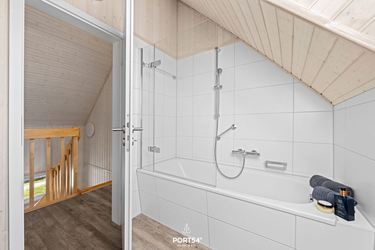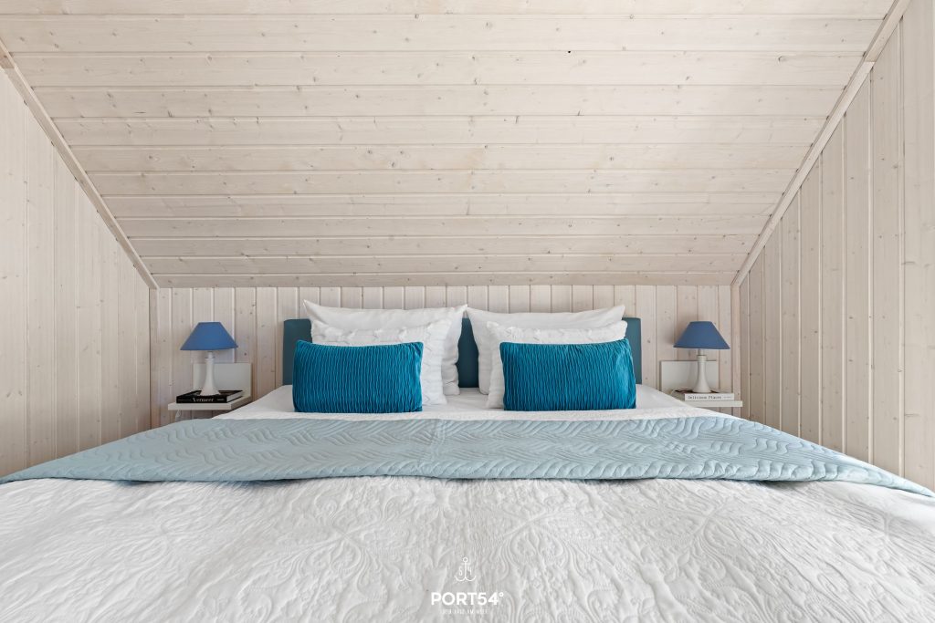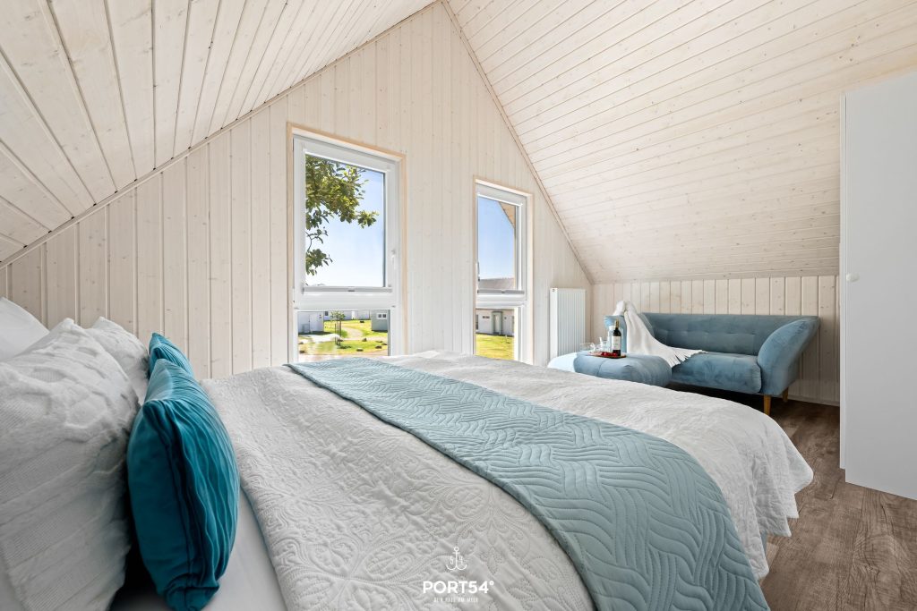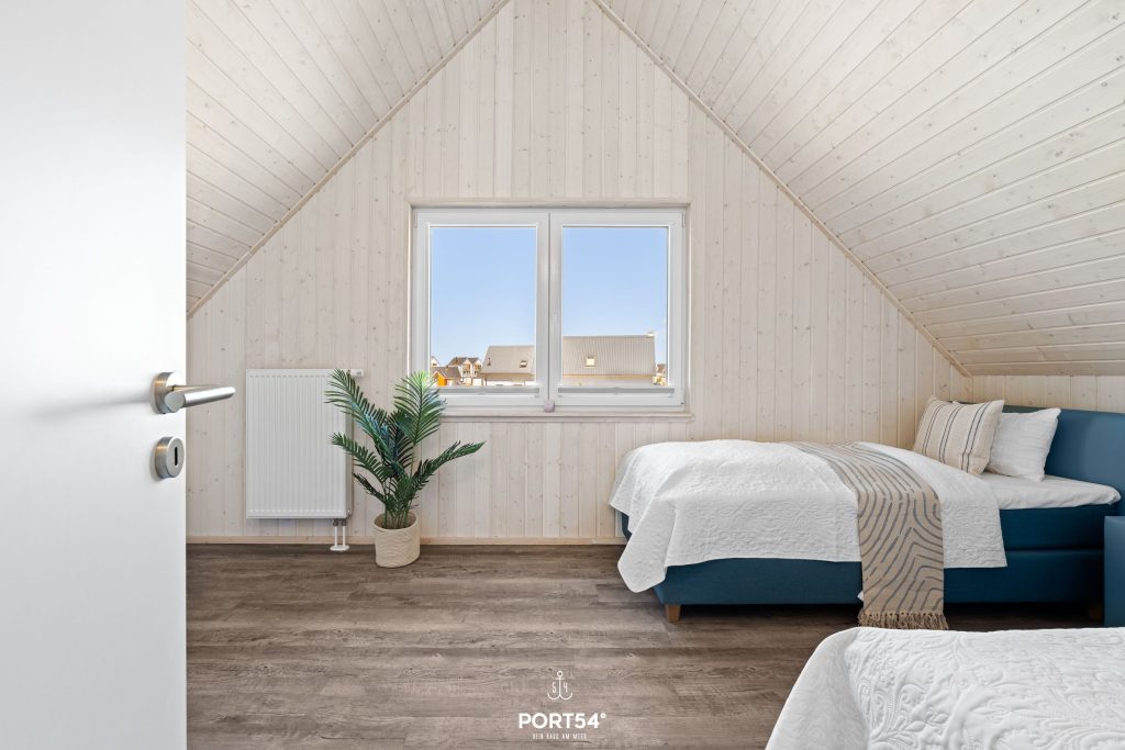 Im Obergeschoss befinden sich zwei großzügige Schlafzimmer mit Boxspringbetten. Ein Schlafzimmer verfügt über ein Boxspringbett (200x200 cm), im zweiten Schlafzimmer befinden sich zwei Einzel-Boxspringbetten (je 100x200 cm).