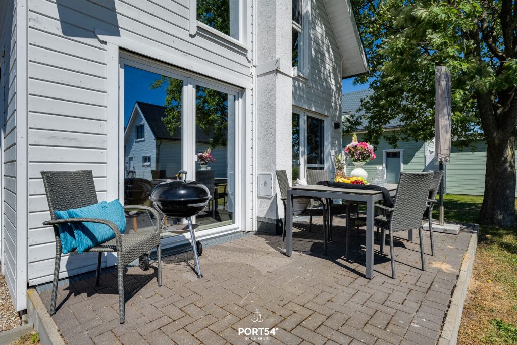 Vom Wohnzimmer aus betrittst Du die 12 m² große Terrasse, die zum Entspannen einlädt. Die Terrasse bietet neben Gartenmöbeln einen Sonnenschirm sowie einen Holzkohlegrill. Gemütlichem Grillen an lauen Sommerabenden steht somit nichts im Wege.