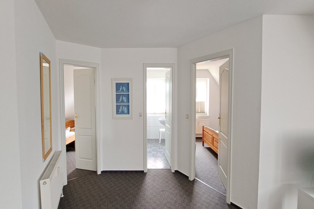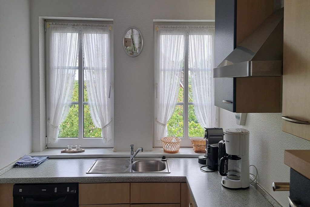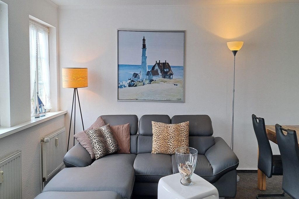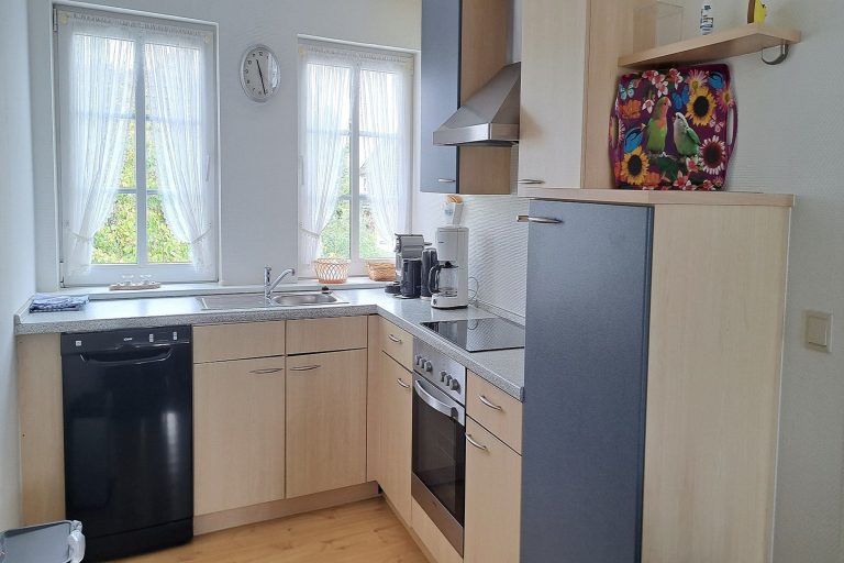 Die Ferienwohnung besteht aus zwei gemütlichen Schlafzimmern, einem hellen Wohnzimmer und einem modernen Badezimmer. Der offene Küchenbereich ist mit allem ausgestattet, was Sie für die Zubereitung Ihrer Lieblingsgerichte benötigen. Neben modernen Elektrogeräten wie Herd, Backofen, Spülmaschine und Kühlschrank stehen Ihnen Kaffeemaschine, Toaster und Wasserkocher zur Verfügung. Sollte es einmal regnerisch sein, lädt die Sofaecke im Wohnzimmer dazu ein, sich zurückzulehnen und einen Film auf dem Fernseher zu genießen.