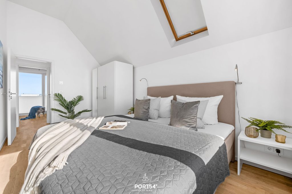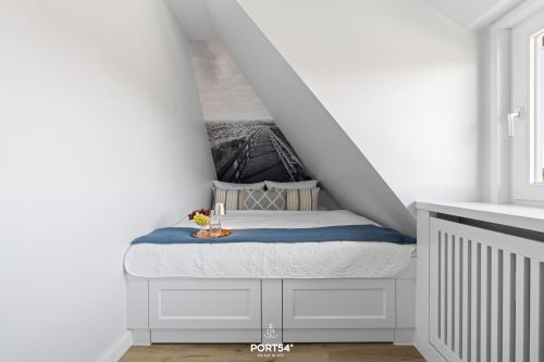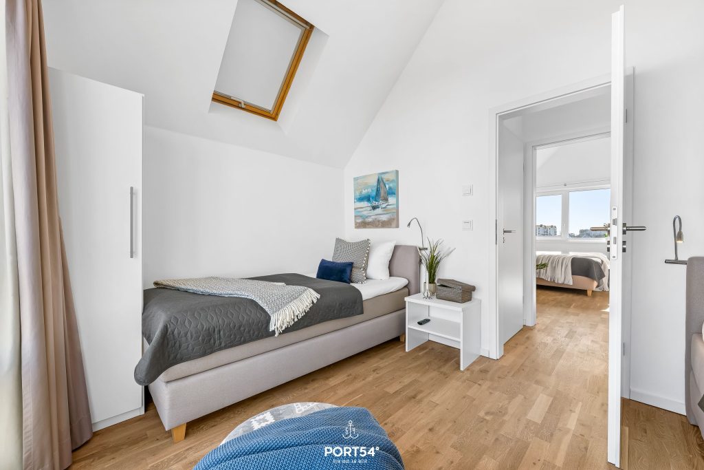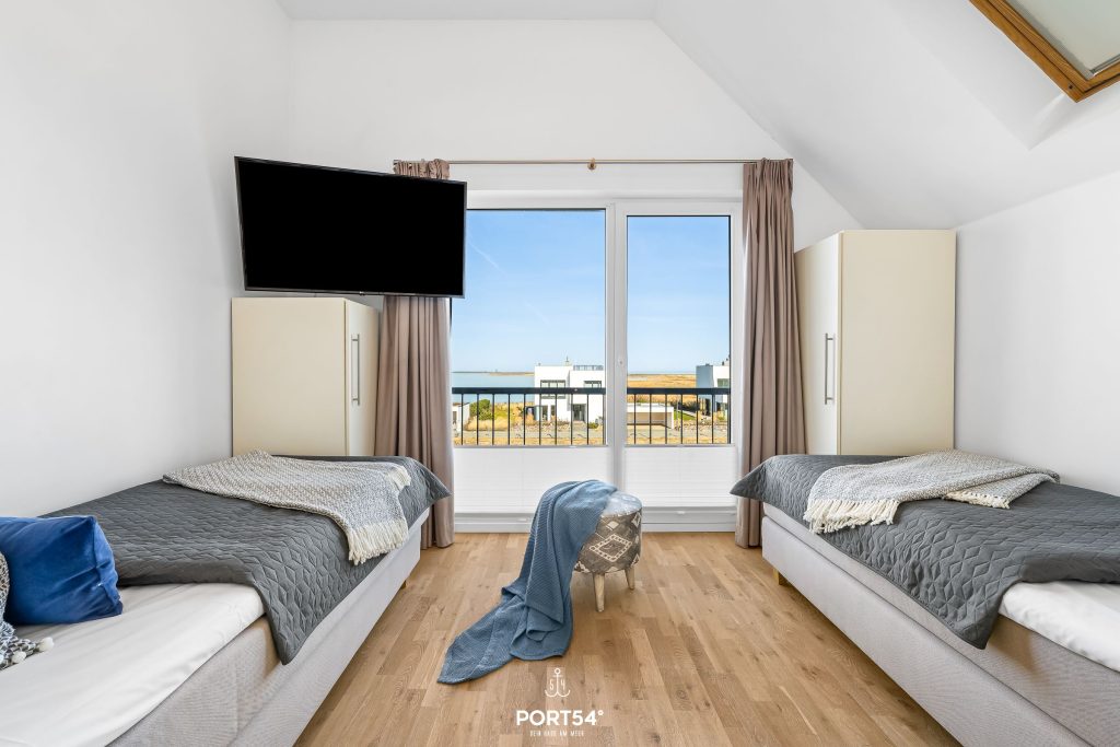 Das Hauptschlafzimmer ist mit einem Boxspringbett (180 × 200 cm) ausgestattet, das zweite Schlafzimmer verfügt über zwei Einzelbetten (je 100 × 200 cm) – perfekt für Kinder oder Freunde. Außerdem befindet sich in jedem der Schlafzimmer je ein Kleiderschrank, ein TV und Verdunkelungsmöglichkeiten.