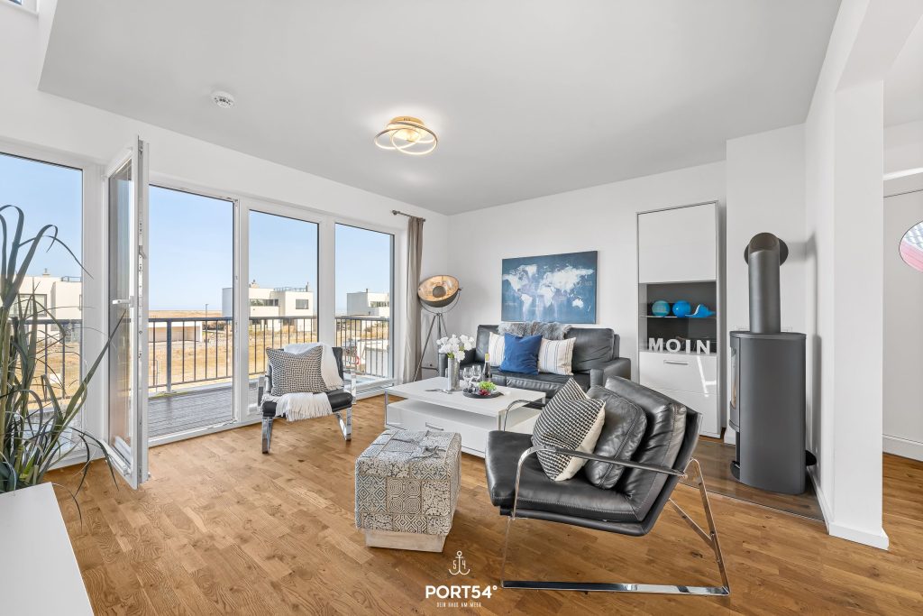 Auf den 2 Balkonen mit Meerblick, Gartenmöbeln, Elektrogrill und Strandkorb lässt sich die maritime Atmosphäre perfekt genießen. Dank der Lage in erster Reihe am Meer bieten sich von fast überall in der Wohnung herrliche Ausblicke auf Wasser und Landschaft.