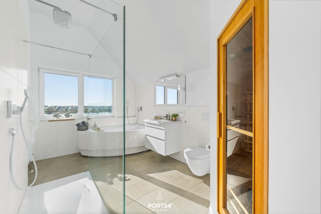 Auch in den Badezimmern setzt sich der hochwertige Stil fort. Das Hauptbad ist modern ausgestattet mit Dusche, Whirlwanne, Kosmetikspiegel und Haartrockner – ideal für entspannte Wellnessmomente nach einem Tag am Meer. Ein zweites Duschbad im ersten Obergeschoss rundet den Komfort ab. Ein besonderes Highlight ist die Infrarotkabine, die Dir nach einem Tag an der Ostsee wohltuende Entspannung bietet. Die Fußbodenheizung sorgt das ganze Jahr über für angenehmes Raumklima.