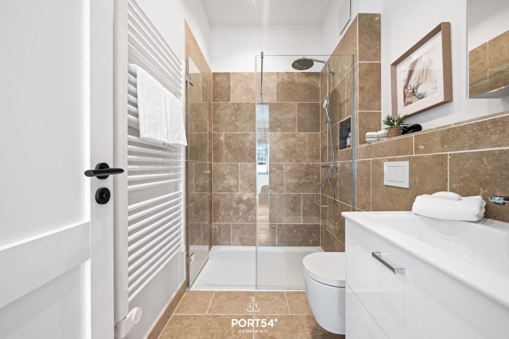 Im modernen Badezimmer findest du eine ebenerdige Dusche, ein WC, einen Föhn, einen Handtuchtrockner und Natursteinfliesen.