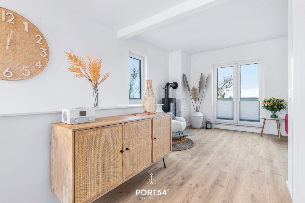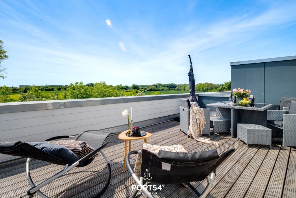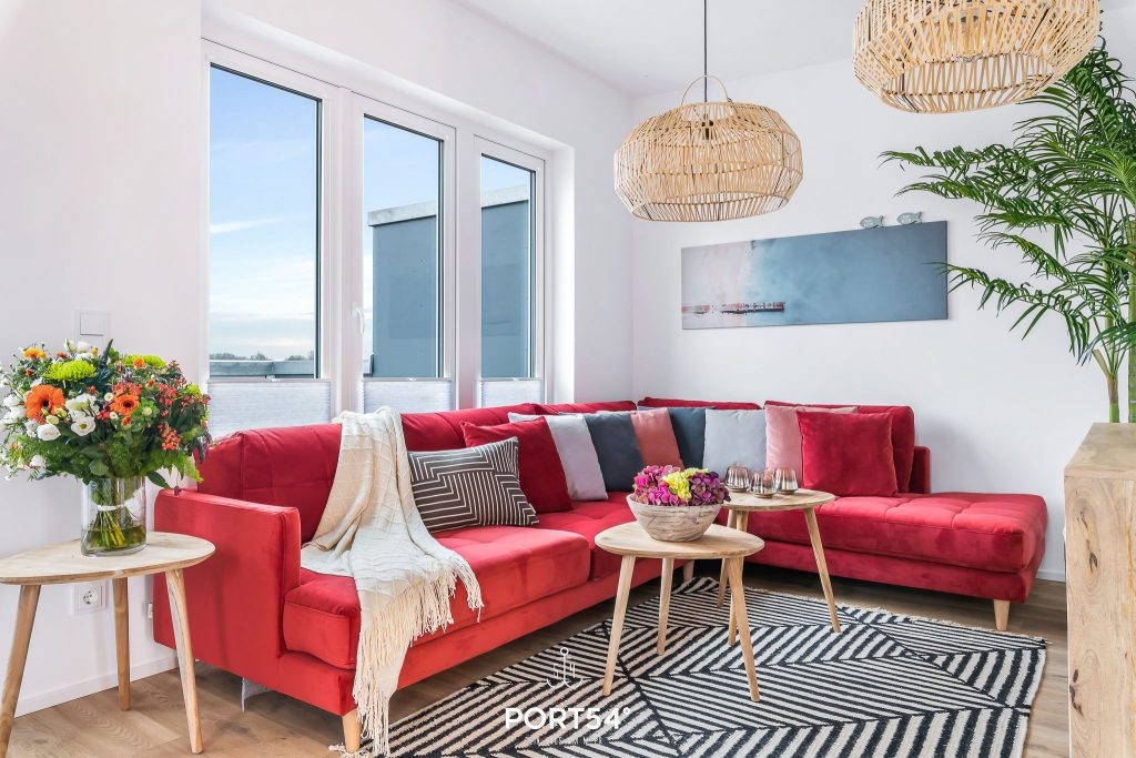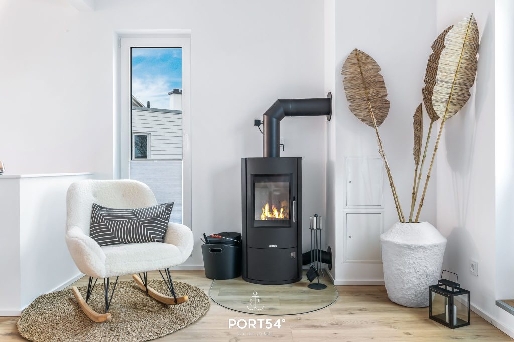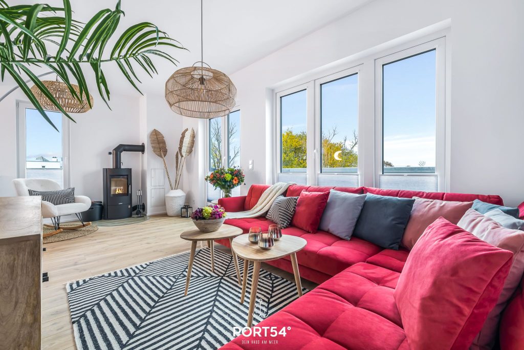 Im offen gestalteten Wohnzimmer mit Kamin und Zugang zur großzügigen Dachterrasse kannst Du es Dir auf der großen Couch gemütlich machen.