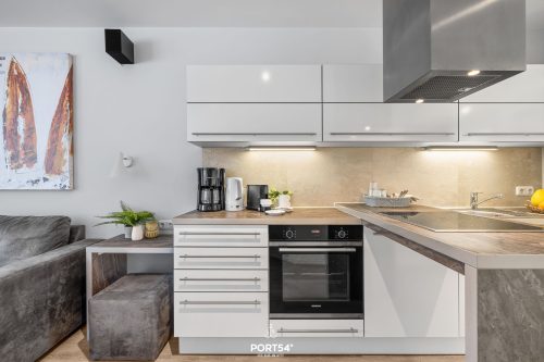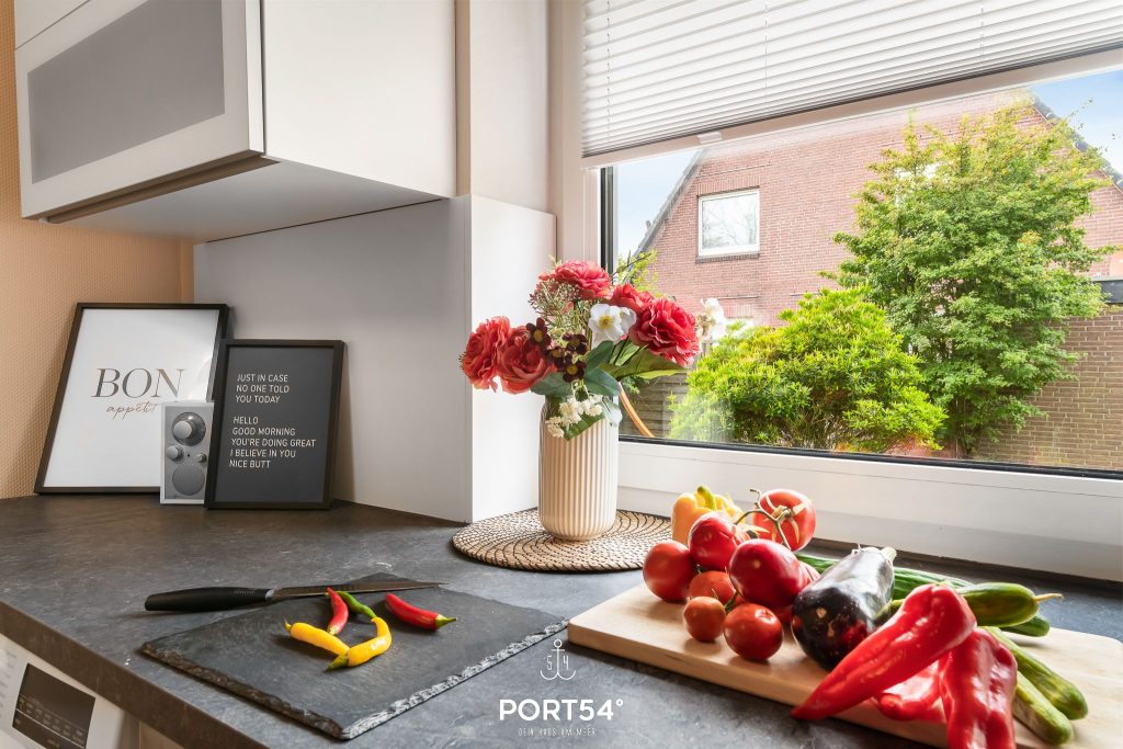 Die separate Küche schafft einen angenehmen Raum zum Kochen. Sie ist mit einem Cerankochfeld und einem Backofen ausgestattet und lädt dazu ein, vielfältige Gerichte zuzubereiten. Außerdem stehen dir ein Kühlschrank mit Gefrierfach, eine Mikrowelle, eine Spülmaschine, eine Kaffeemaschine, ein Wasserkocher und ein Toaster zur Verfügung – alles, was du für einen komfortablen Küchenalltag brauchst. In der Küche können zudem zwei Personen bequem auf Hochstühlen Platz nehmen.