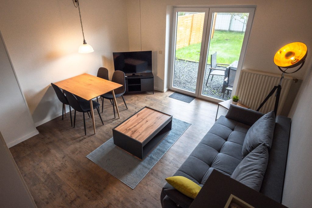 Das Herzstück der Unterkunft ist der offene Wohn- und Essbereich mit gemütlichem Ambiente. Die moderne, offene Küche ist vollständig ausgestattet mit 2-Platten-Herd, Mikrowelle, Kühlschrank mit Gefrierfach, Toaster, Kaffeemaschine, Wasserkocher sowie Geschirr und Küchenutensilien. Der Essbereich lädt zu gemeinsamen Mahlzeiten ein, während die Sofaecke zum Entspannen einlädt. Ein digitaler Fernseher und schnelles WLAN (mindestens 100 Mbit/s) stehen dir ebenfalls zur Verfügung.