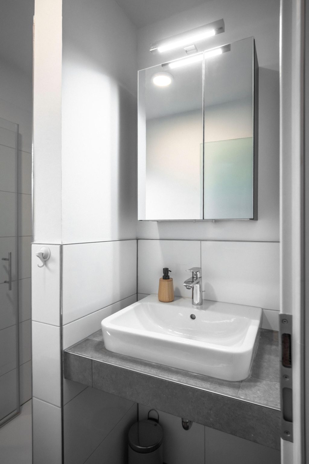 Das Badezimmer verfügt über eine bodengleiche Dusche, Waschbecken, WC und Spiegel sowie eine Erstausstattung an Hygieneartikeln. Zusätzlich stehen dir eine Garderobe, ein Ganzkörperspiegel und eine gemeinschaftlich nutzbare Waschmaschine zur Verfügung.