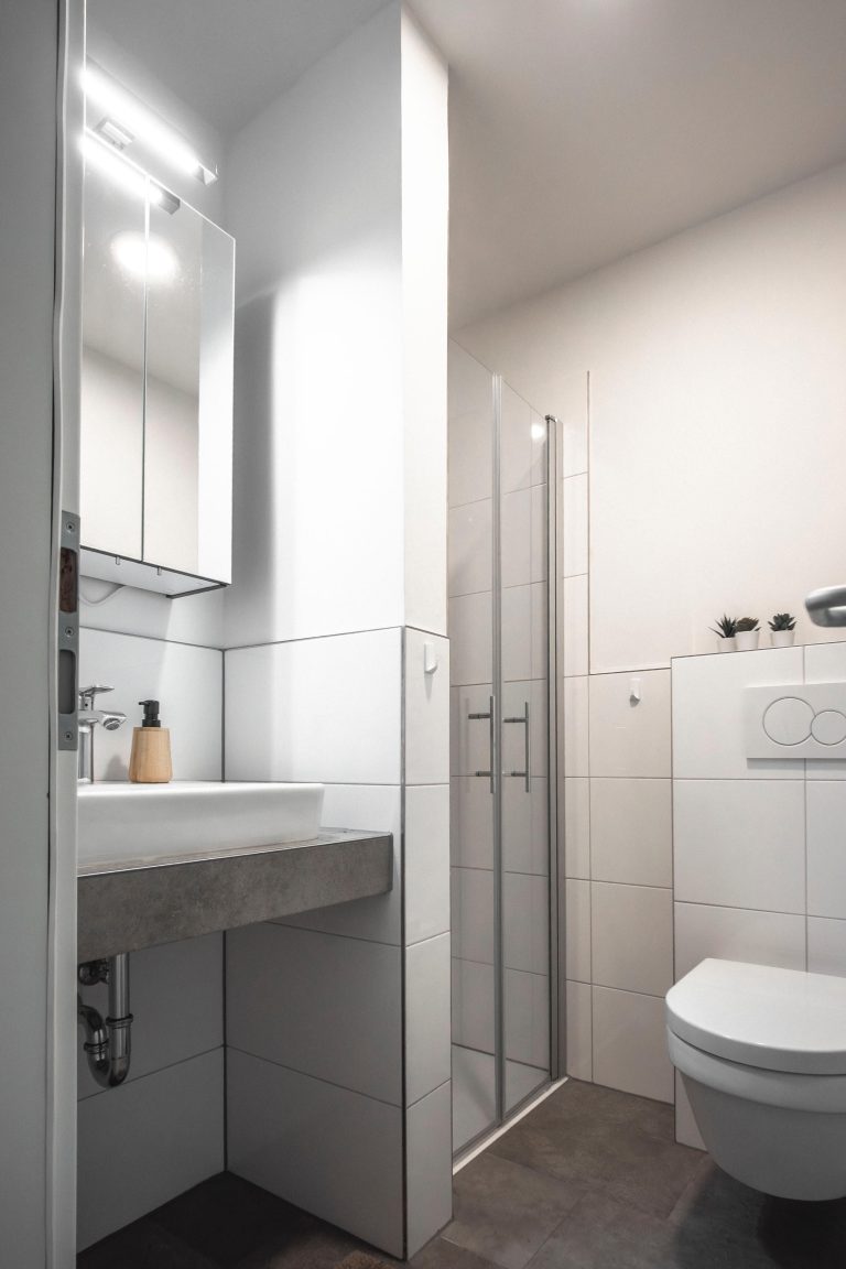 Das Badezimmer ist kompakt, aber modern und verfügt über eine bodengleiche Dusche, Waschbecken, WC und Spiegel. Für zusätzlichen Komfort sorgen ein Ganzkörperspiegel sowie Rauchmelder und ein Feuerlöscher für deine Sicherheit.
