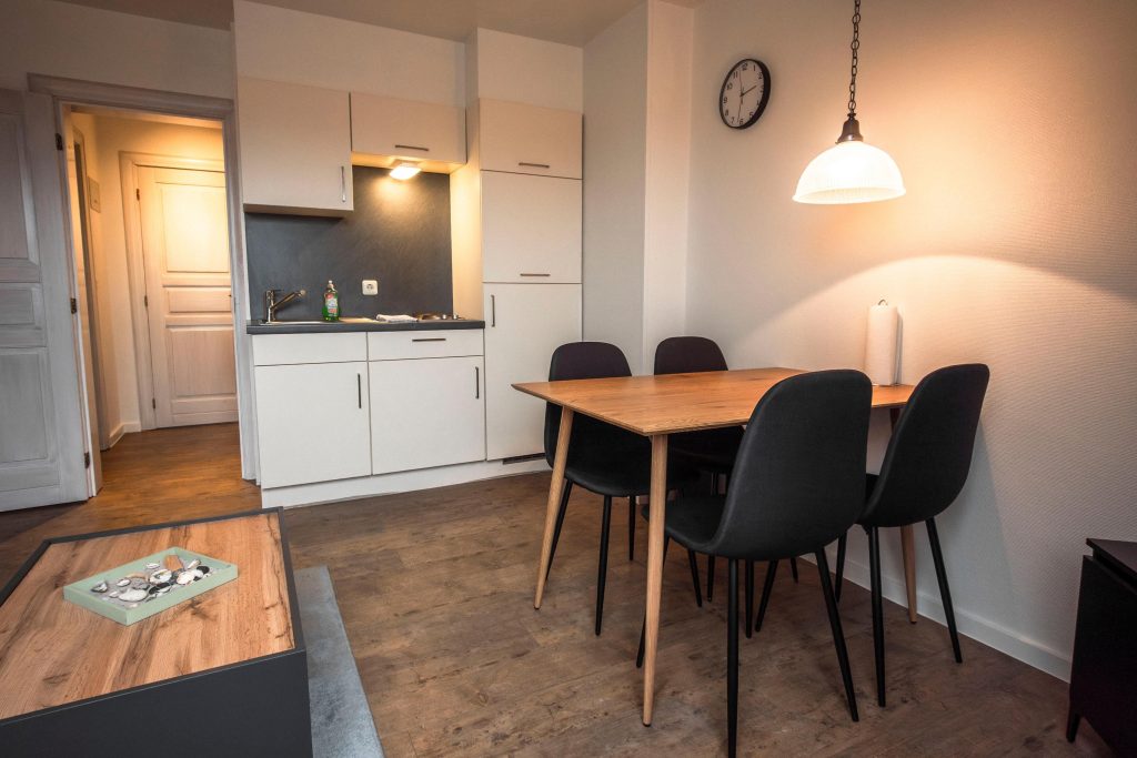Das modern eingerichtete Apartment verfügt über zwei Zimmer, darunter ein separates Schlafzimmer mit Schlafmöglichkeiten für zwei Personen. Im Wohnbereich findest du eine gemütliche (Schlaf-)Sofaecke sowie einen Essbereich mit Tisch und Garderobe.
