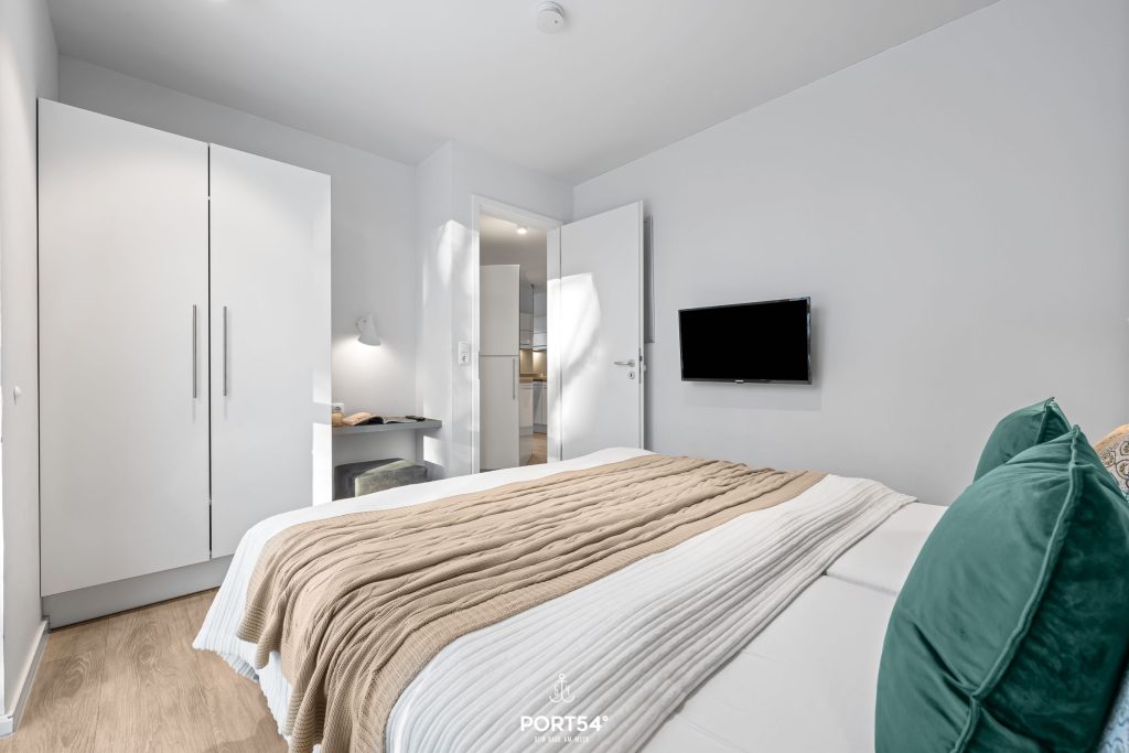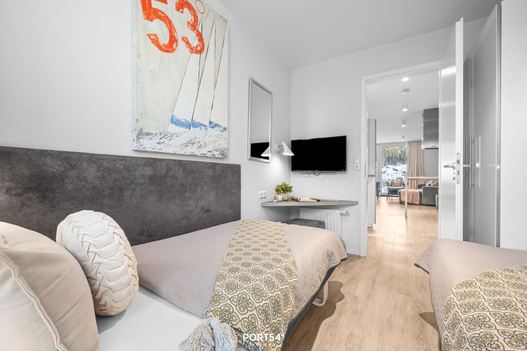 Die Ferienwohnung verbindet moderne Ausstattung mit einer stilvollen und zugleich wohnlichen Atmosphäre. Drei separate Schlafzimmer, alle mit langlebigem Vinylboden, bieten Privatsphäre und Flexibilität. Zwei Schlafzimmer sind jeweils mit Doppelbetten (180x200 cm) ausgestattet, das dritte Schlafzimmer verfügt über zwei Einzelbetten (90x200 cm).