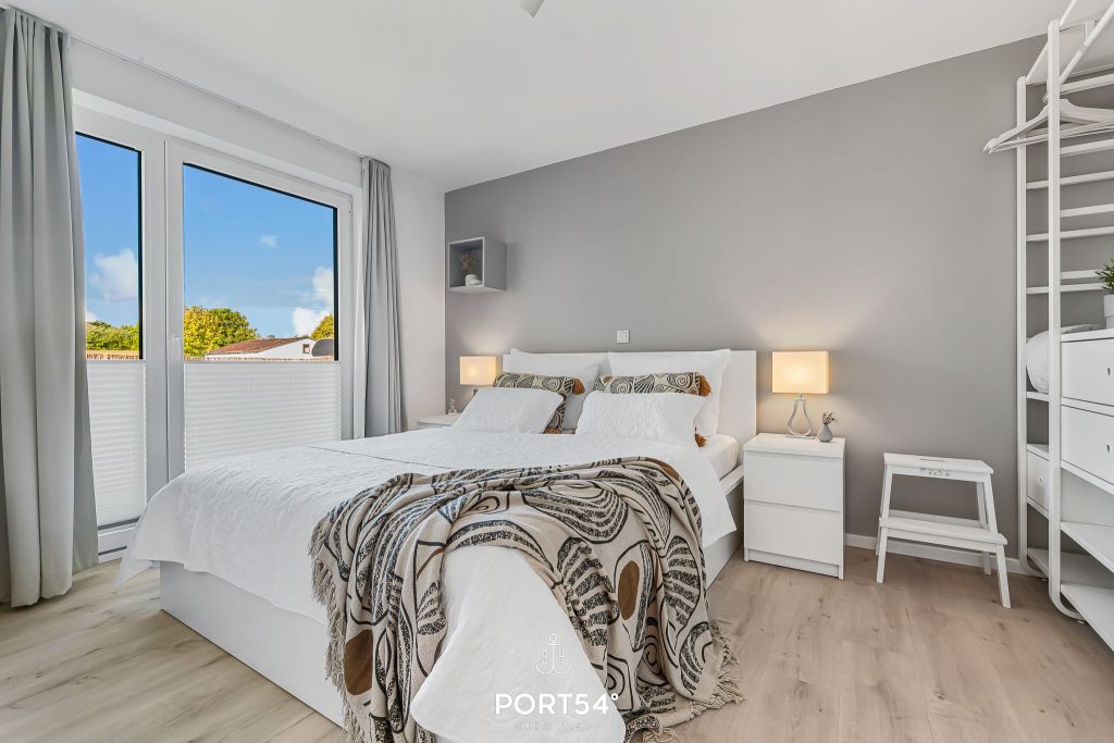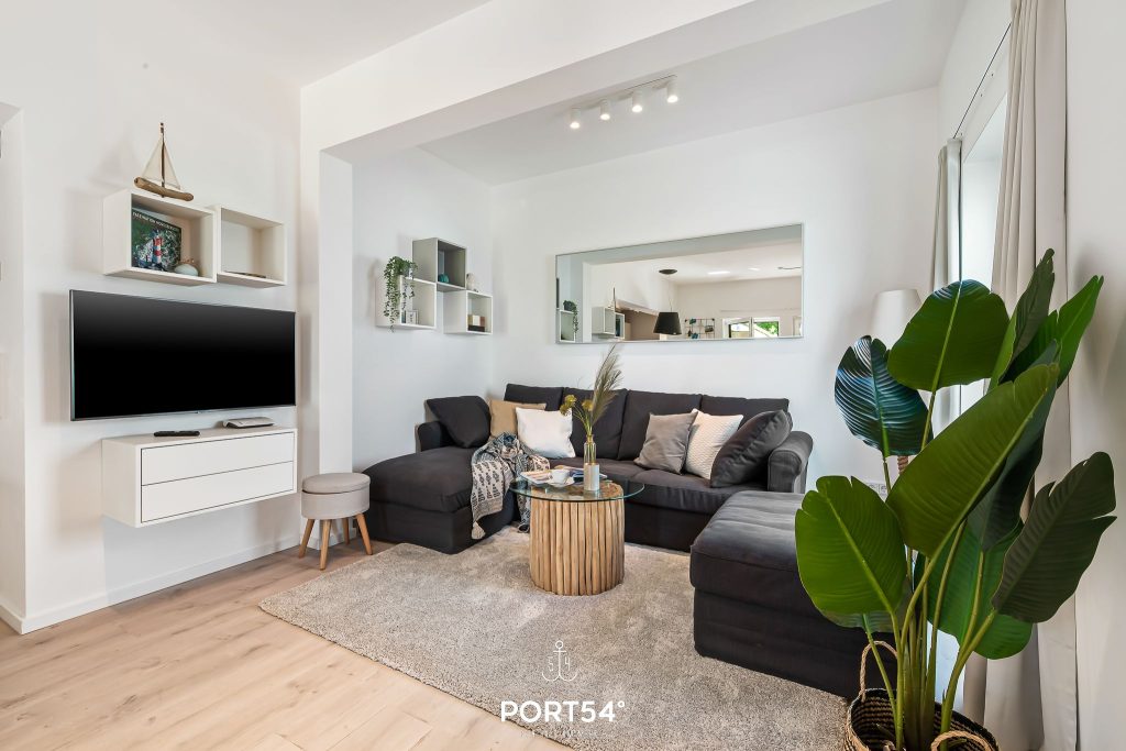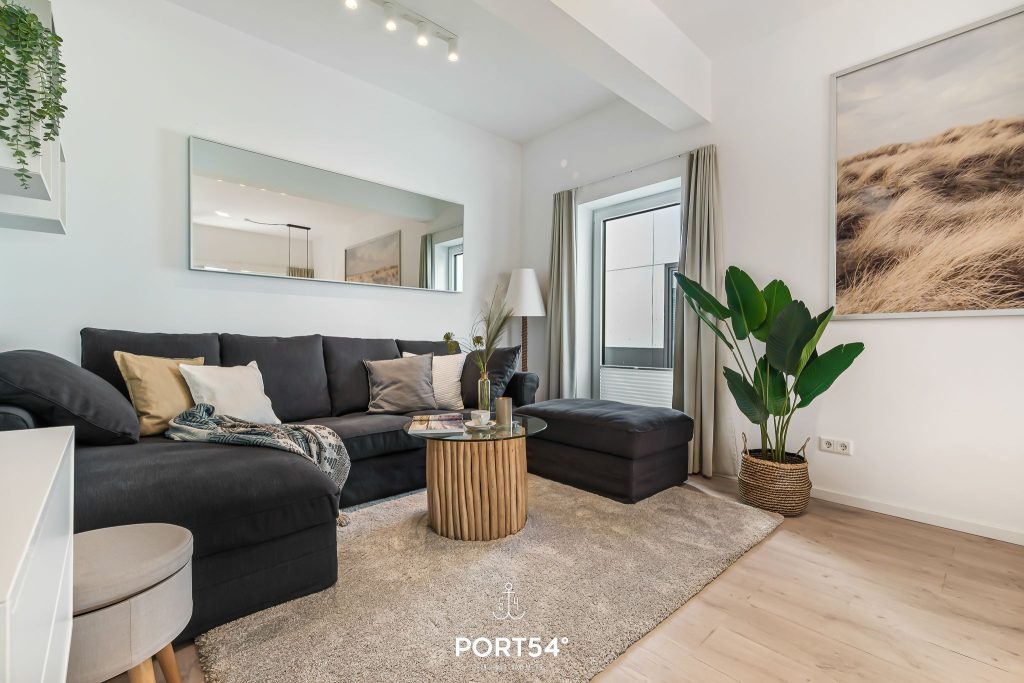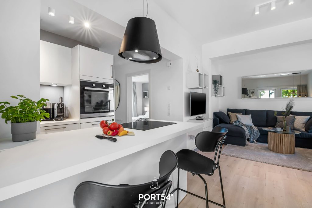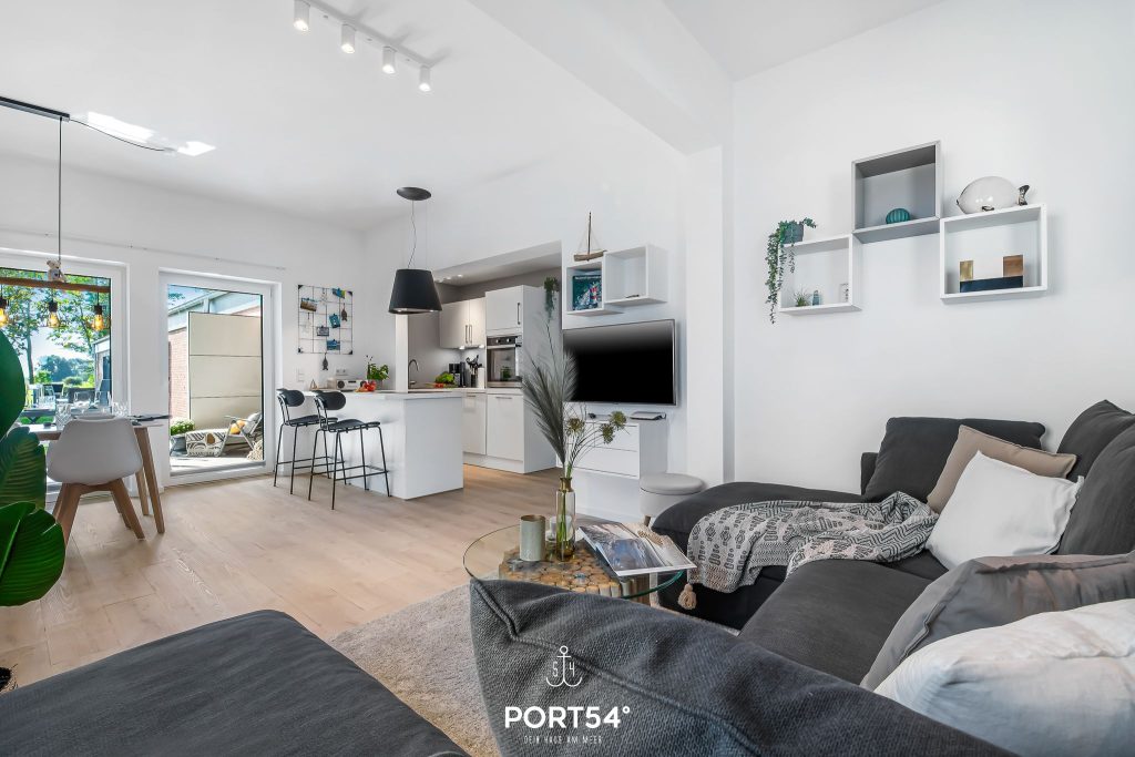 Im geräumigen Wohnzimmer kannst du es dir gemütlich machen. Die offene Küche mit angrenzendem Essbereich ist modern und komplett ausgestattet und lädt dich zum gemeinsamen Kochen ein. Das Schlafzimmer ist hochwertig mit einem Doppelbett (200 x 200 cm) eingerichtet. Für bis zu zwei weitere Personen steht im Wohnzimmer ein gemütliches Schlafsofa bereit. Das helle Badezimmer verfügt über eine ebenerdige Dusche und – wie die gesamte Wohnung – über eine angenehme Fußbodenheizung.