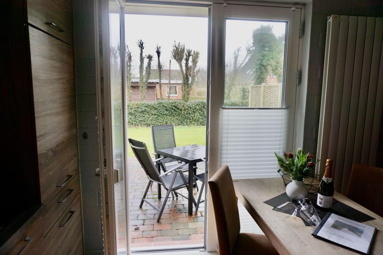 Direkt vom Wohnbereich können Sie auf die Terrasse, lehnen Sie sich auf den gemütlichen Gartenmöbeln doch einfach mal zurück und genießen die frische Nordseeluft..