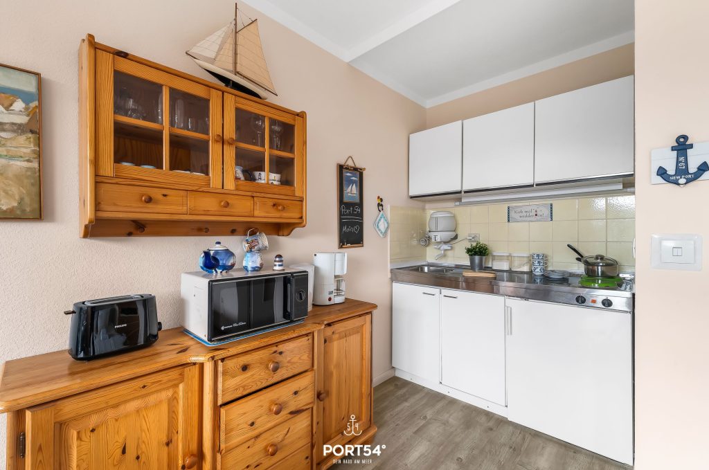 Die Küche ist mit Ceran-Herd, Mikrowelle, Kühlschrank mit Gefrierfach, Kaffeemaschine, Wasserkocher und Toaster ausgestattet. Geschirr, Besteck, Küchenutensilien, Geschirrhandtücher und Abfalleimer sind vorhanden, eine Erstausstattung ist inklusive. Das Badezimmer verfügt über WC, Waschbecken, Dusche, Kosmetikspiegel und Haartrockner.