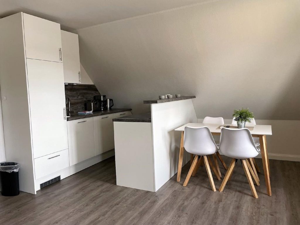 Die offene Küche ist vollständig ausgestattet und bietet dir alle Annehmlichkeiten, die du für deinen Aufenthalt brauchst. Dazu gehören Herd, Backofen, Kühlschrank, Mikrowelle, Kaffeemaschine sowie Geschirr und Besteck. Ob Frühstück oder gemeinsames Abendessen – hier findest du alles, was du benötigst.