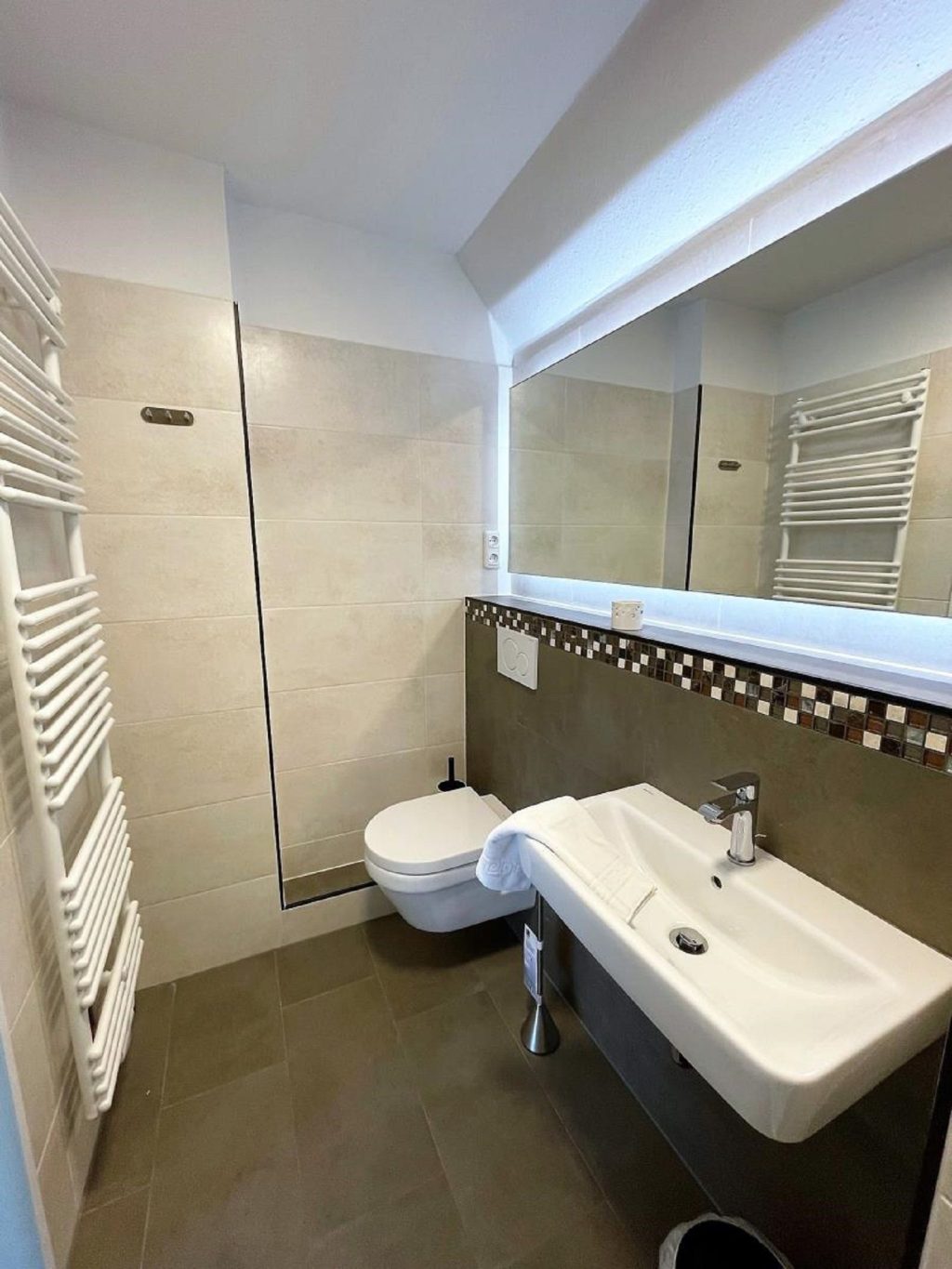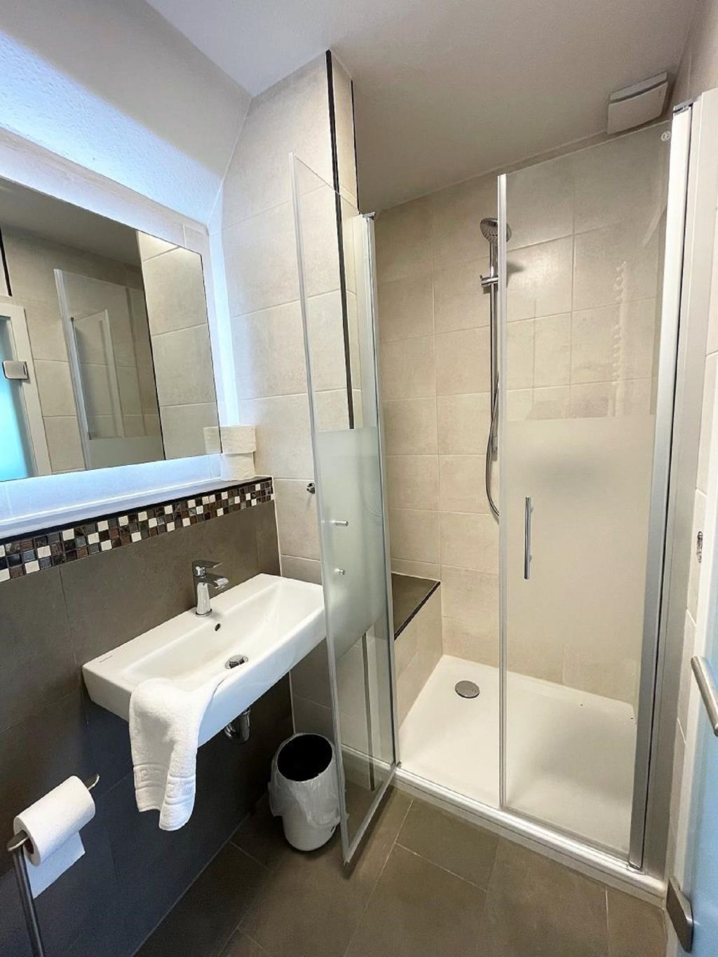 Das modern gestaltete Badezimmer verfügt über eine bodengleiche Dusche, ein Waschbecken und ein WC.
