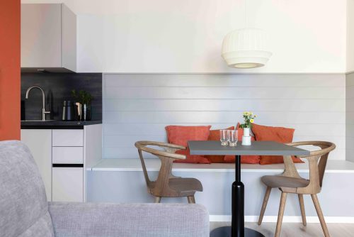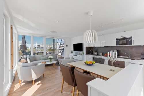 Das App. 14 befindet sich im 2. OG (Dachgeschoss). Küche mit Induktionsherd, Ofen, Spülmaschine, KEINE Mikrowelle, dafür aber eine Waschmaschine in die Küchenzeile integriert! Ein Schlafzimmer mit Doppelbett und eins mit Etagenbett. Perfekt für eine Familie zwei Kindern. Balkon mit Gartenmöbeln und schönem Blick auf Bäume und Felder. Buchung, An- und Abreise waren sehr gut organisiert (alle wichtigen Informationen erhielten wir übersichtlich per Mail, Ansprechpartner sind zudem immer erreichbar). Danke.