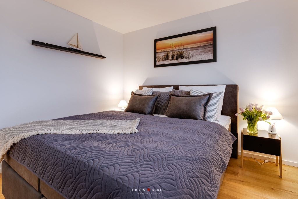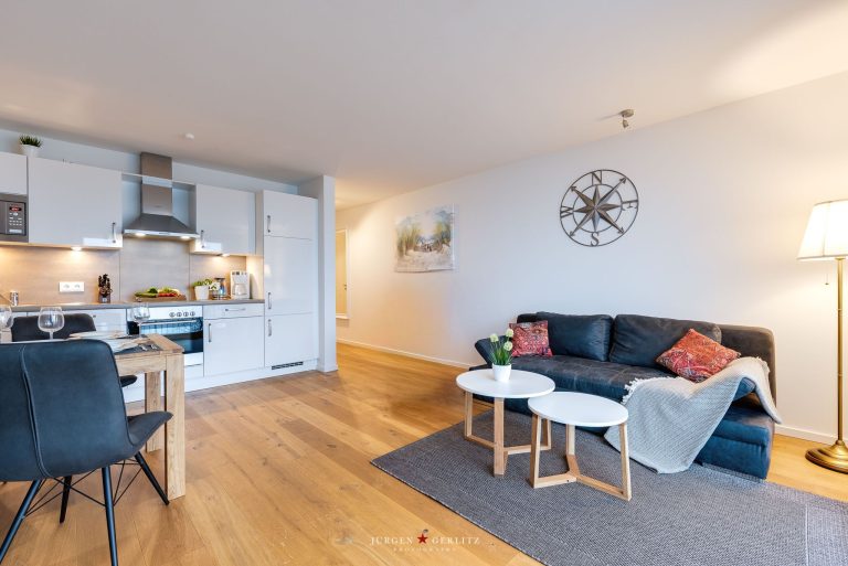 Diese Ferienwohnung besticht vor allem durch ihren loftähnlich gestalteten Wohn- und Essbereich, der dank seiner anteilig bodentiefen Fenster zu jeder Tageszeit einladend hell und freundlich wirkt.