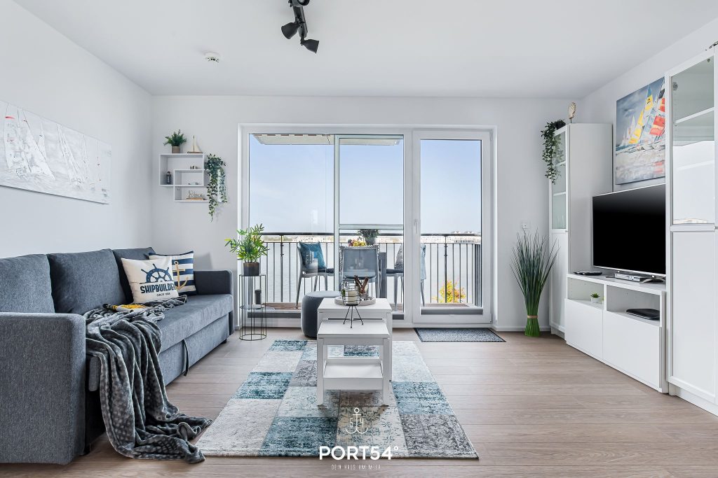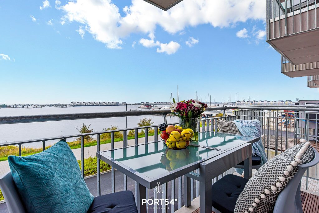 Der loftartige Wohn- und Essbereich der „Hafenmelodie“ beeindruckt mit bodentiefen Fenstern, die den Raum in helles Tageslicht tauchen und...
