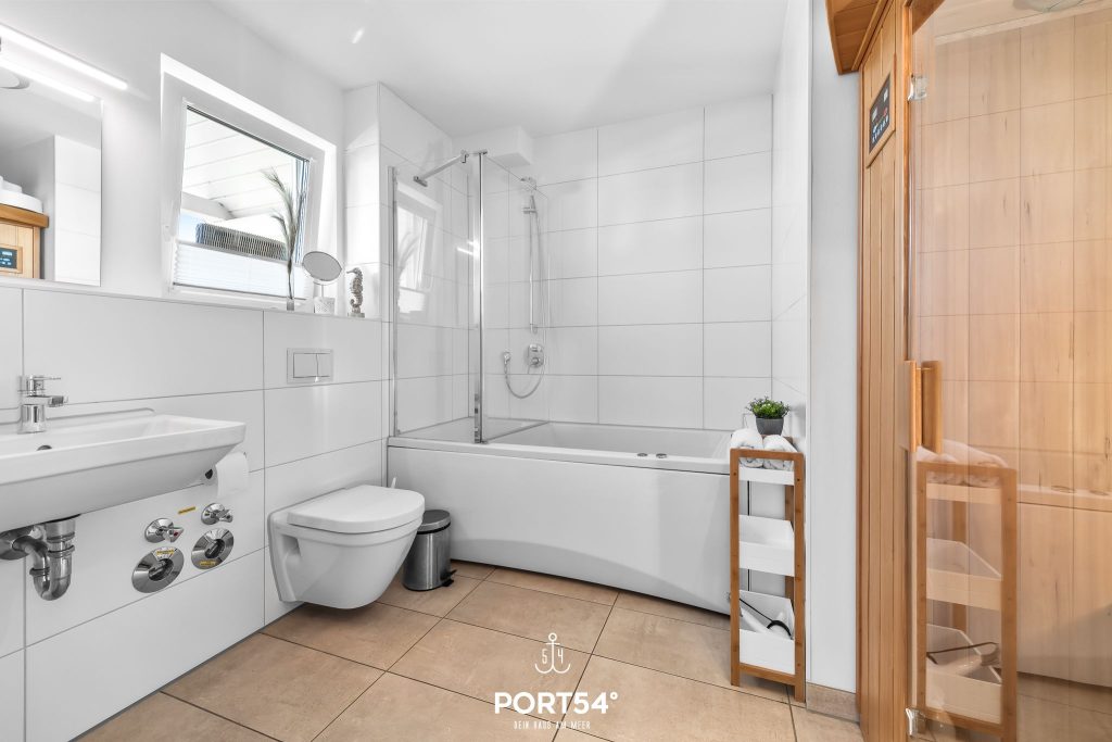 Im Badezimmer kannst Du nach langen Strandspaziergängen in der Infrarot-Sauna mit HiFi-Soundsystem herrlich relaxen. Alternativ lädt die Whirlwanne an kalten Tagen zum Entspannen ein.
