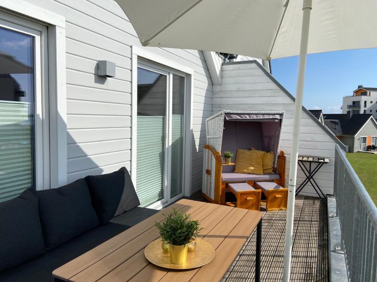 Die Wohnung hat zwei Terassen und auf einer davon einen ganz neuen Standkorb, den wir mit einem leckeren Cocktail in der Hand direkt mal ausprobiert haben – herrlich in der Abendsonne. Auch ansonsten ist die Wohnung komplett. Ein gemütliches Boxspringbett, Fernseher, Whirlwanne und Infrarotkabine. Alles, was das Herz begehrt.