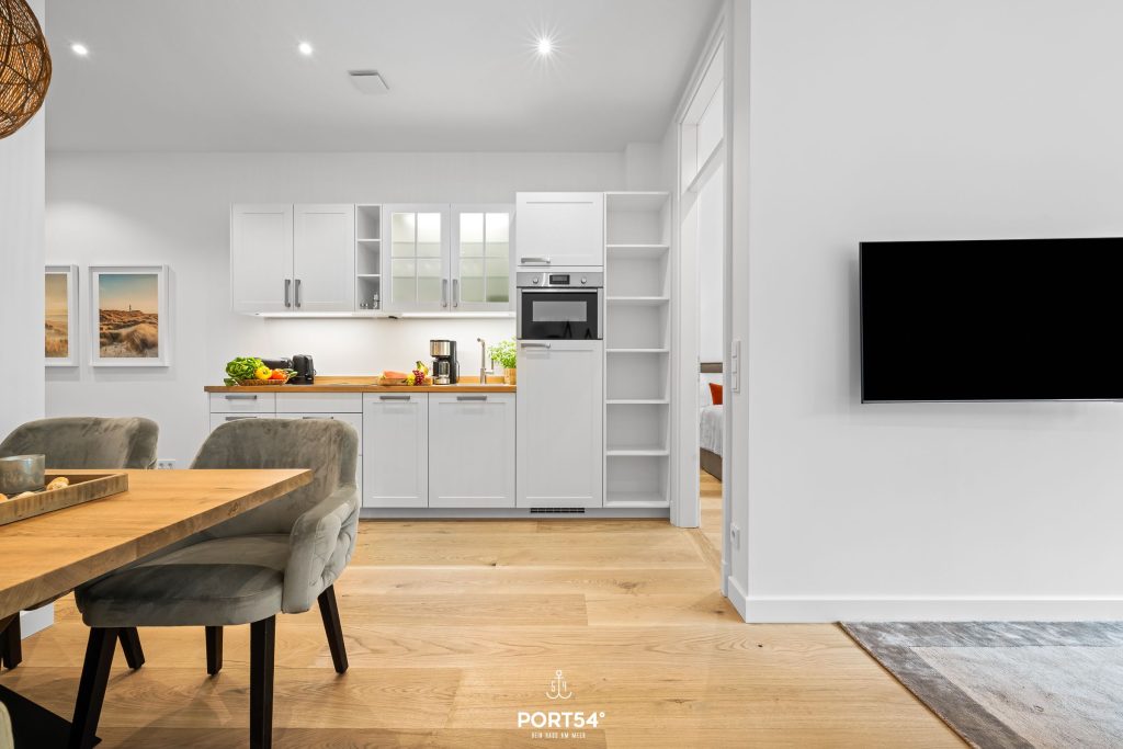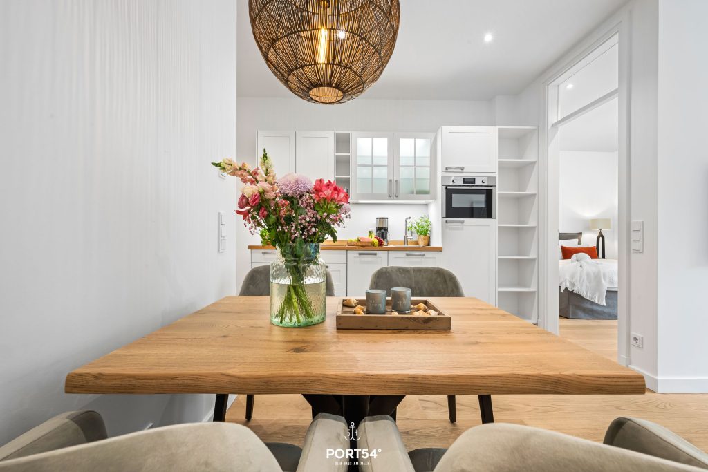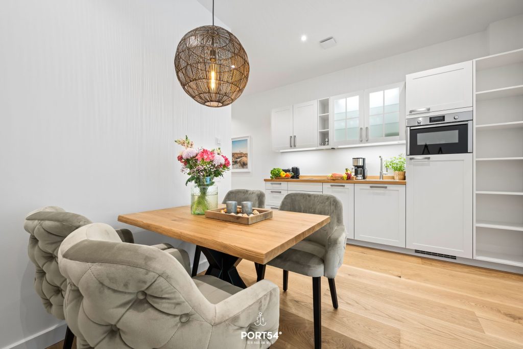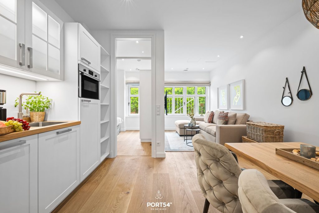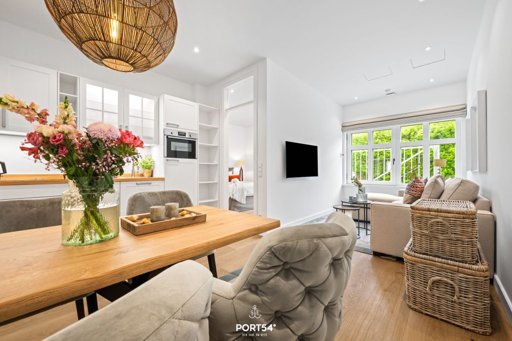 Mit einer großzügigen Grundfläche von 43 m² bietet die im Erdgeschoss gelegene Ferienwohnung ausreichend Platz für bis zu vier Personen. Die lichtdurchfluteten Räume sind geschmackvoll eingerichtet, und die offene Küche, die zum Wohnzimmer hin gestaltet ist, lädt dich dazu ein, kulinarische Köstlichkeiten zuzubereiten. Hier findest du alle notwendigen Geräte wie einen Elektroherd mit Induktionskochfeld, einen Backofen, eine Spülmaschine, einen Kühlschrank mit Gefrierfach und vieles mehr. Das Schlafzimmer ist mit einem gemütlichen Doppelbett, Verdunkelungsmöglichkeiten und einem Smart-TV ausgestattet. Einen weiteren Schlafplatz bietet dir die gemütliche Schlafcouch.