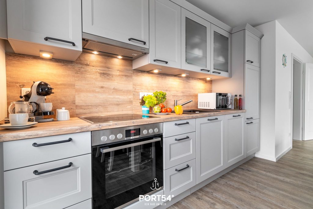 Die Küche ist bestens ausgestattet mit Cerankochfeld, Backofen, Mikrowelle, Spülmaschine, Kühlschrank mit Gefrierfach, Wasserkocher, Toaster, Kaffeemaschine, Espressomaschine sowie allen notwendigen Geschirr- und Küchenutensilien – ideal für eine komfortable Selbstversorgung.
