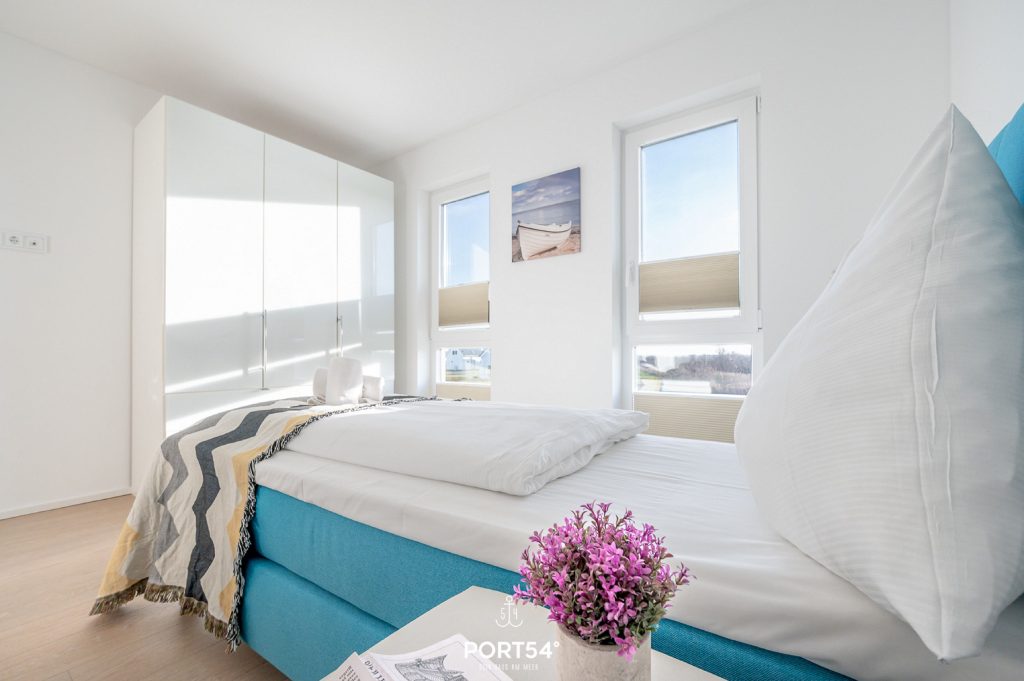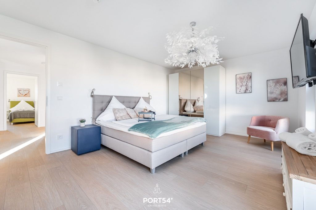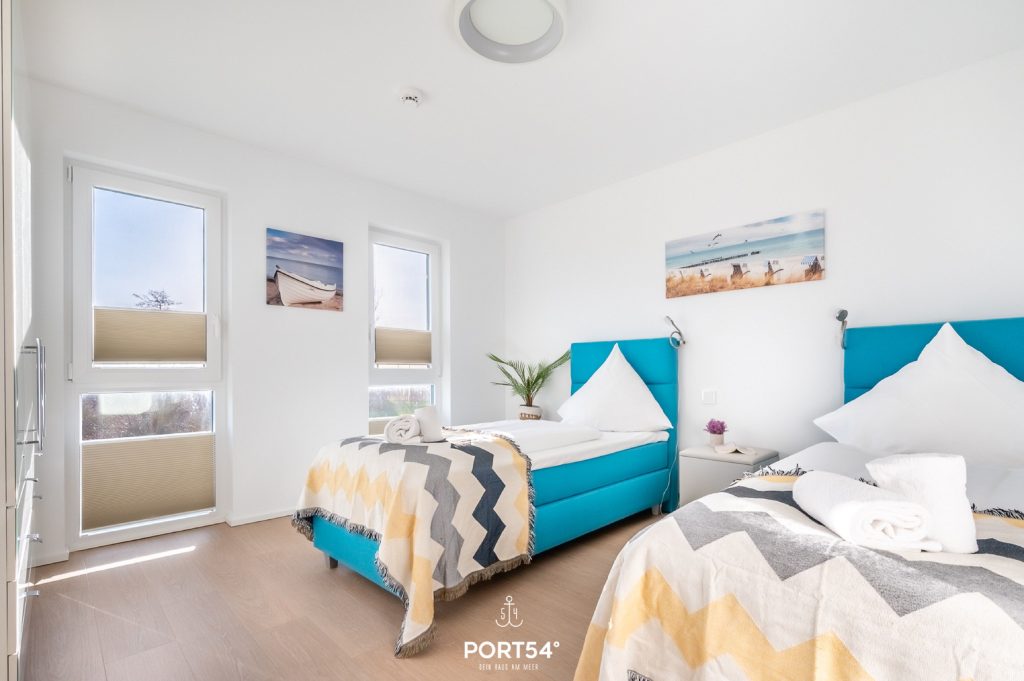 Das eine Schlafzimmer bietet Dir ein Boxspring-Doppelbett (180 × 200 cm) sowie einen Flachbild-TV, die anderen Zimmer sind jeweils mit zwei gemütlichen Boxspring-Einzelbetten (je 90 × 200 cm) eingerichtet.