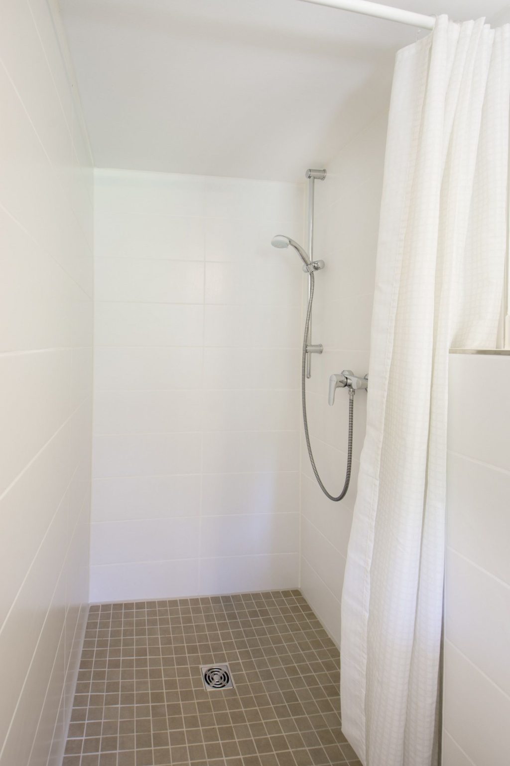 Das Tageslichtbad ist mit einer ebenerdigen Dusche und einem Föhn ausgestattet. Auch ein Schlafzimmer mit einem Doppelbett (180x200cm) und einem Kleiderschrank befindet sich im Erdgeschoss.