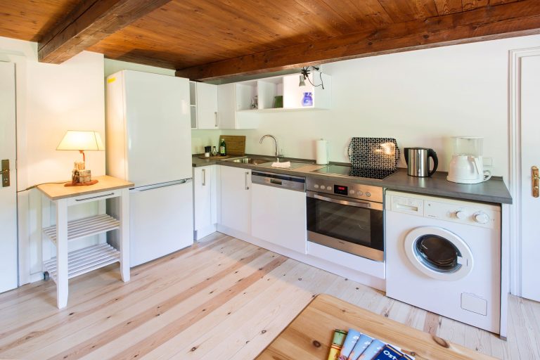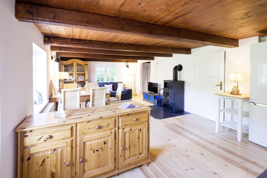 Im Erdgeschoss befindet sich der offene Wohn- und Essbereich mit der Küchenzeile. In der voll ausgestatteten Küche findest Du alles, was für einen Kochabend mit der ganzen Familie gebraucht wird. Danach kannst Du es Dir auf dem Sofa gemütlich machen und einen Film schauen. Sollte das Wetter einmal nicht mitspielen, mach es Dir vor dem Kamin im Wohnzimmer gemütlich und genieße oder erlebe Filme und Serien via Netflix.