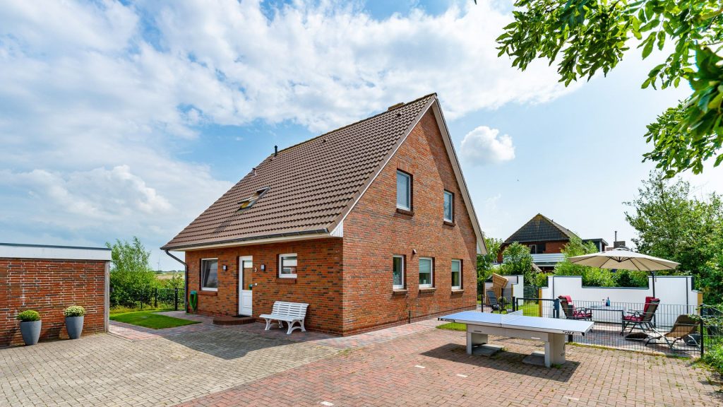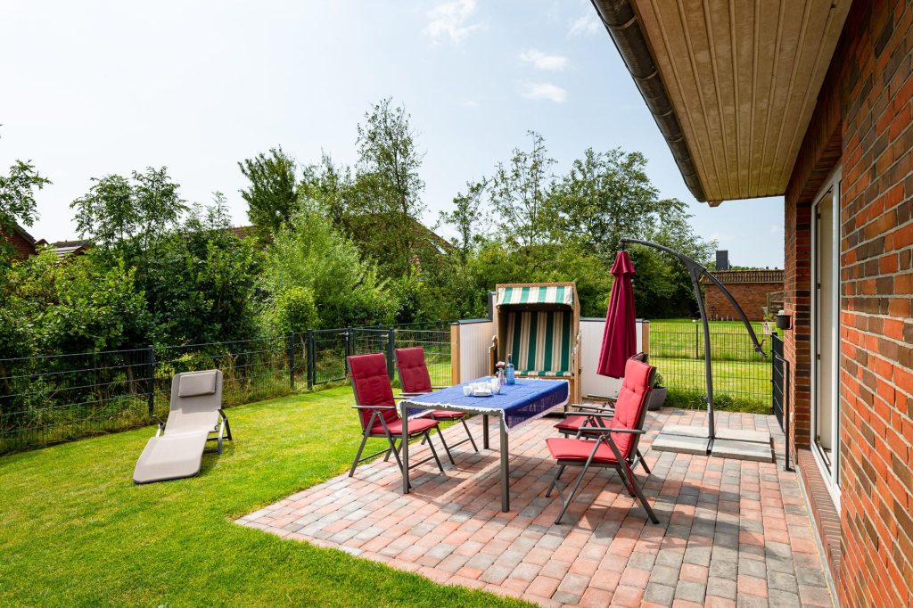An sonnigen Tagen zeigt sich die Wohnung auch im Außenbereich von ihrer schönsten Seite. Die Terrasse beziehungsweise Sonnenterrasse mit Gartenmöbeln lädt dazu ein, die frische Nordseeluft in vollen Zügen zu genießen. Ob beim Frühstück im Freien, bei einem entspannten Nachmittag in der Sonne oder bei einem ruhigen Ausklang des Tages – hier kannst Du wunderbar abschalten und den Blick über die grüne Liegewiese schweifen lassen. Für Sonnenliebhaber stehen zudem Liegen bereit, die zu entspannten Stunden im Freien einladen.