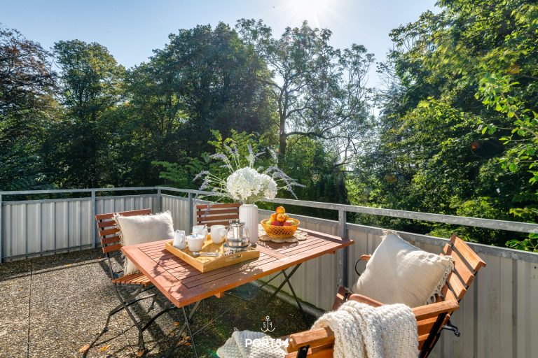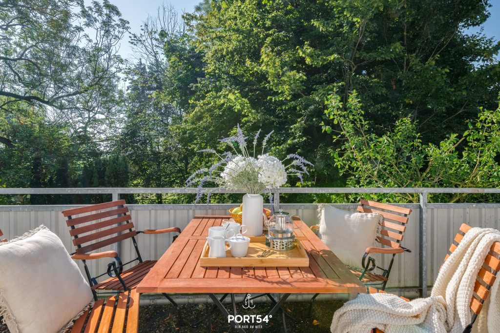 Zwei Balkone (Süd und Ost) mit hochwertigen Möbeln bieten den perfekten Ort, um die warmen Tage zu genießen. Ein Grill steht ebenfalls zur Verfügung. Sie blicken von hier direkt ins Grüne.