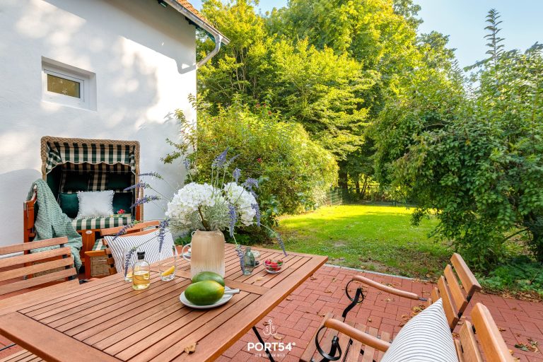 Die Terrasse mit hochwertigen Möbeln bietet einen stilvollen und gemütlichen Platz im Freien zum Entspannen und Genießen der frischen Luft.