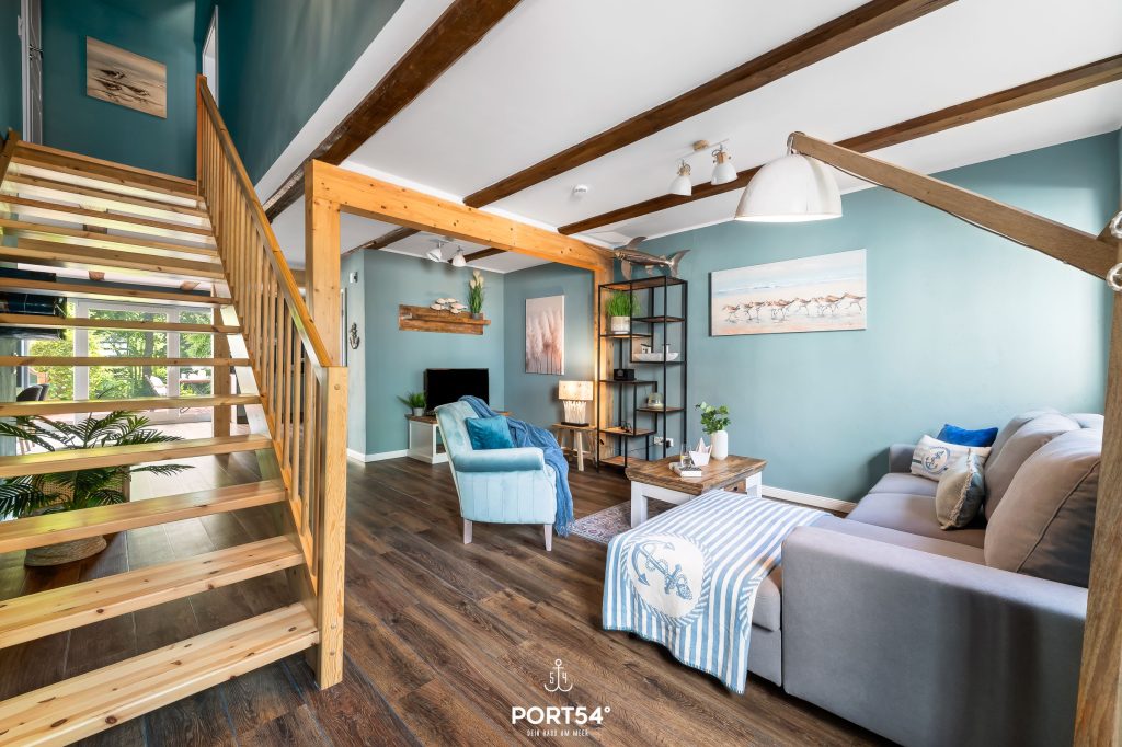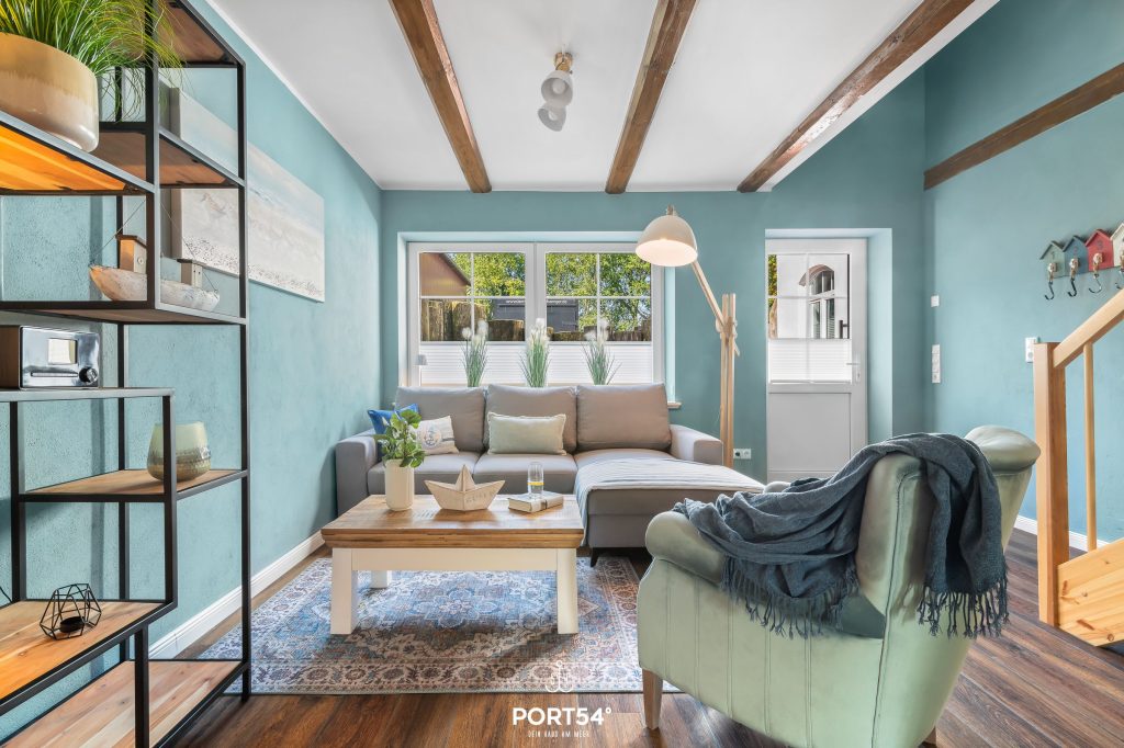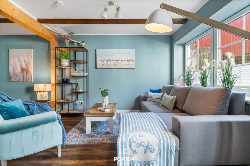 Ein bequemes Sofa bietet Platz für Gäste und kann auch für eine weitere Person zum Schlafen genutzt werden.