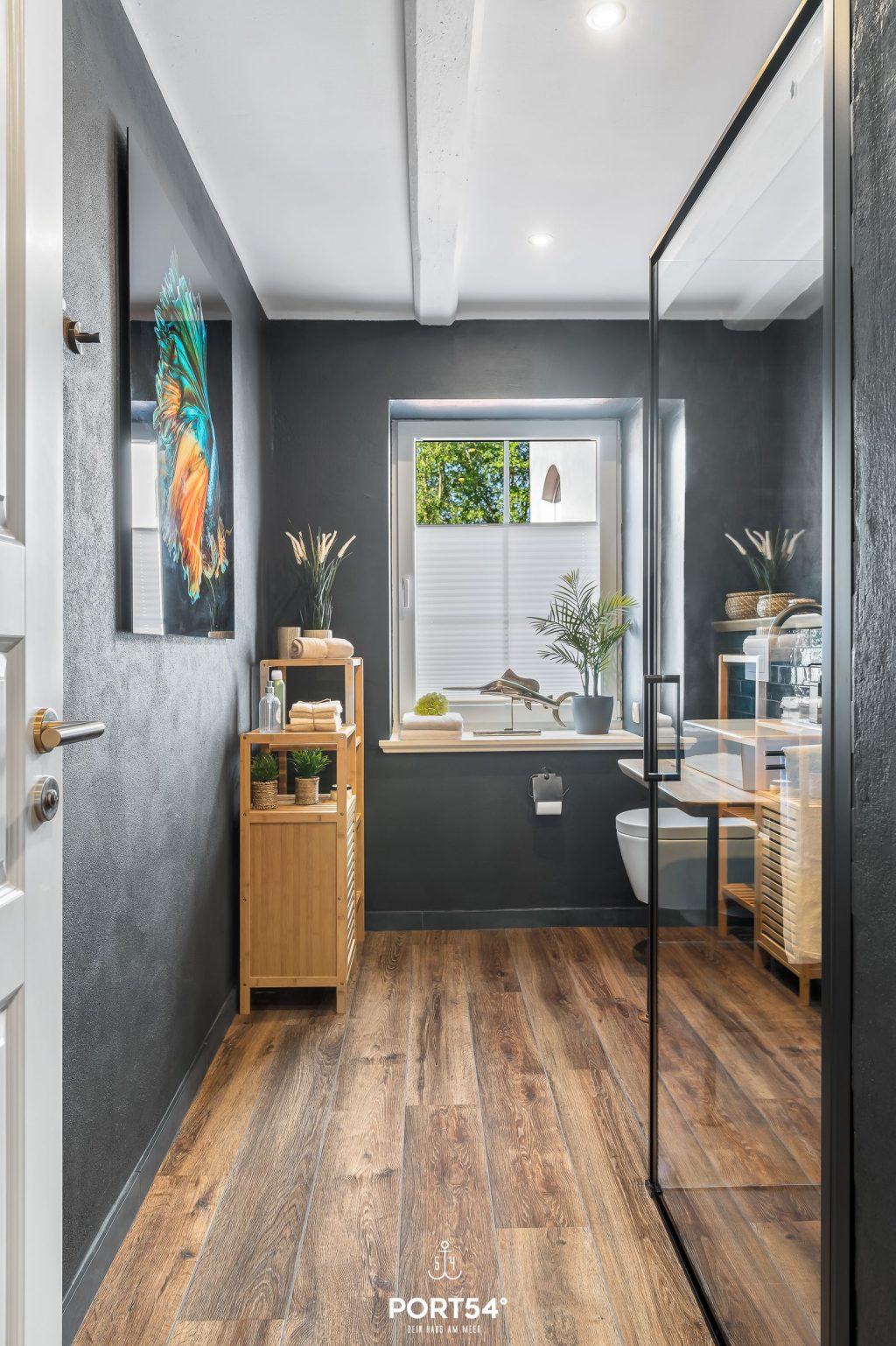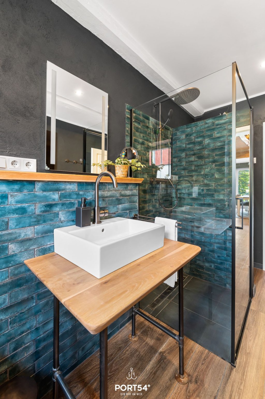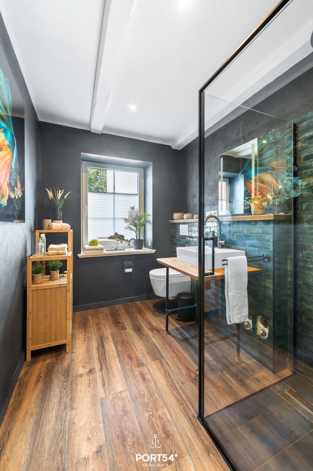 Das außergewöhnliche Badezimmer bietet alle notwendigen Annehmlichkeiten für eine komfortable Nutzung, wie eine bodengleiche Dusche, einen Föhn und ein WC.
