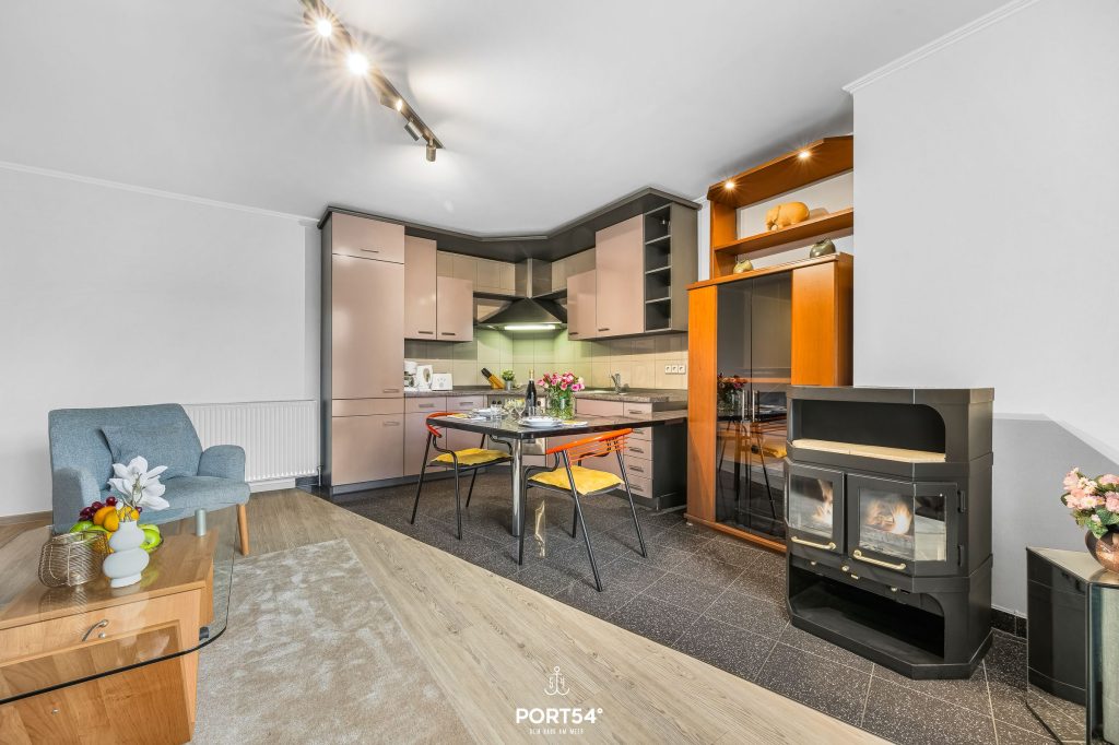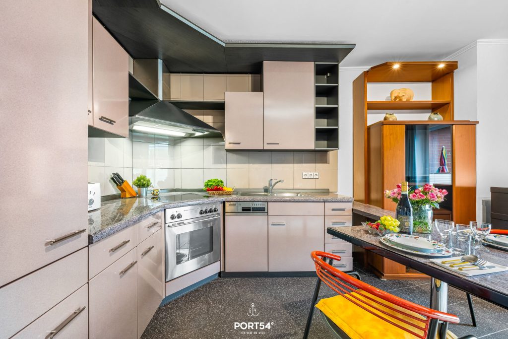 Die offene Küche ist praktisch eingerichtet und bietet alles, was du für die Selbstversorgung brauchst: Cerankochfeld, Backofen, Kühlschrank, Kaffeemaschine, Wasserkocher, Toaster, Küchenutensilien sowie Geschirr und Besteck. Eine Erstausstattung und Geschirrhandtücher sind ebenfalls vorhanden.