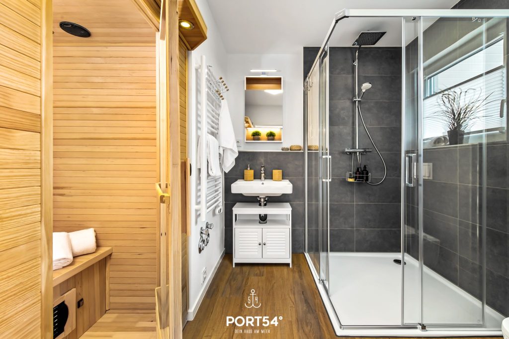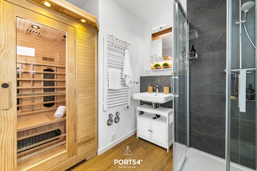 Das geräumige Badezimmer überzeugt mit einer ebenerdigen Dusche und bietet dir zusätzlichen Komfort. Ein besonderes Highlight ist die Infrarot-Sauna, in der du dich gerade nach einem winterlichen Spaziergang wunderbar aufwärmen und entspannen kannst. In Kombination mit dem Kamin ist die Wohnung damit auch in der kalten Jahreszeit ein perfekter Rückzugsort für gemütliche und erholsame Urlaubstage.