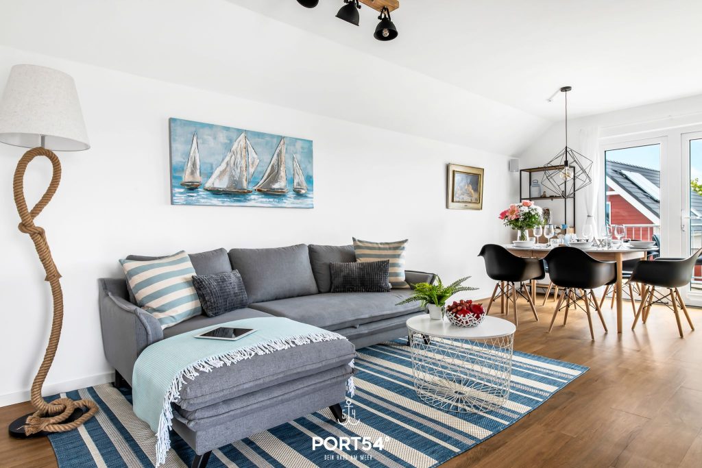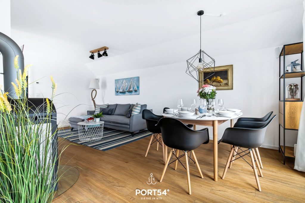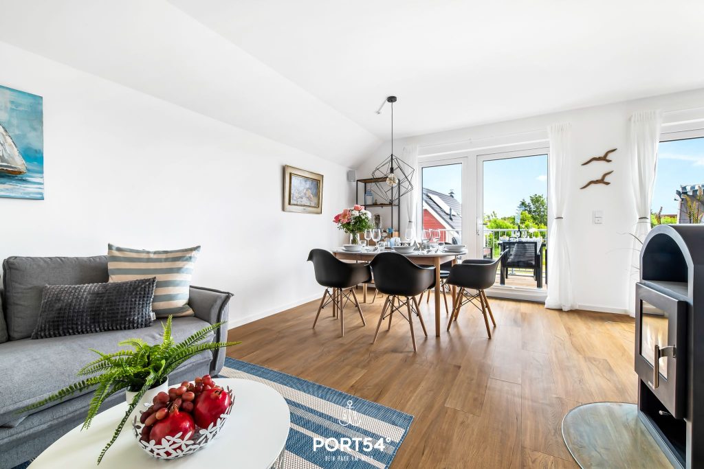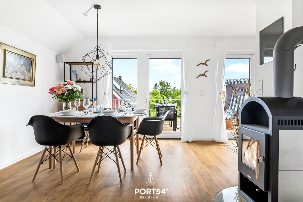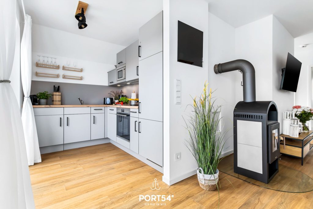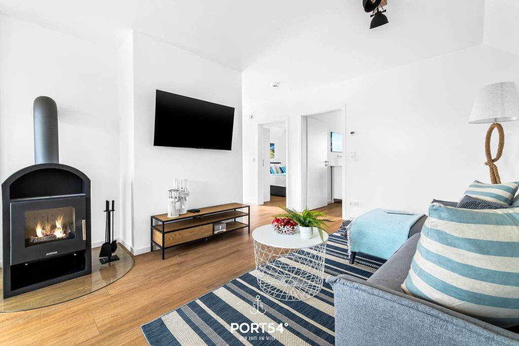 Das Herzstück der Wohnung ist der offene Wohn- und Essbereich mit angrenzender, hochwertig ausgestatteter Küche. Die moderne Küche mit Induktionsherd bietet dir alles, was du für einen komfortablen Aufenthalt brauchst und lädt dazu ein, gemeinsam zu kochen, zu genießen und schöne Stunden miteinander zu verbringen. Der Wohnbereich empfängt dich mit einer behaglichen Atmosphäre und wird besonders in der kalten Jahreszeit zu einem echten Lieblingsplatz. Dann sorgt der Kamin für wohlige Wärme und gemütliche Abende nach einem Spaziergang an der frischen Nordseeluft. Ob mit einer Tasse Tee, einem guten Buch oder in geselliger Runde – hier fühlt sich Urlaub einfach wunderbar entspannt an.