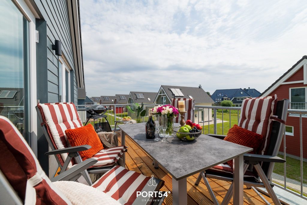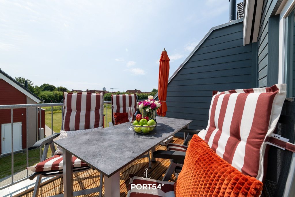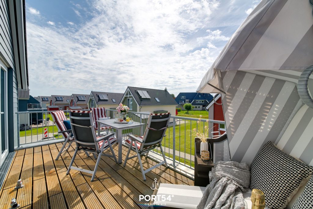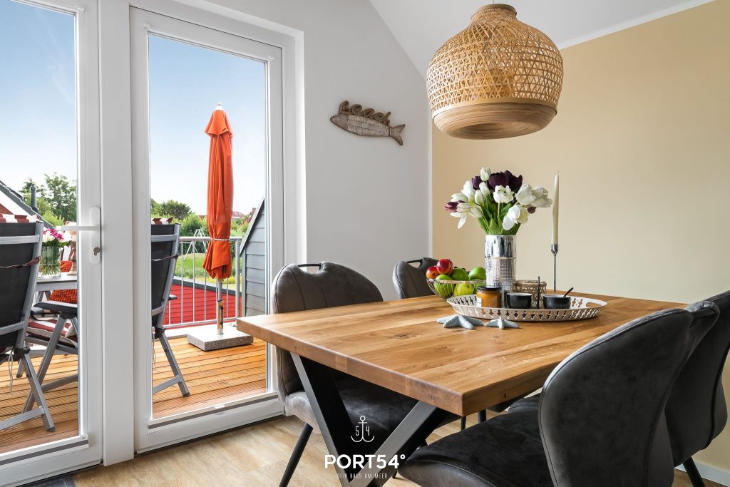 Vom Wohn- und Essbereich aus gelangst du direkt auf den schönen Balkon in Südlage. Hier kannst du deinen Morgenkaffee in der Sonne genießen, im Strandkorb entspannen oder an lauen Sommerabenden Köstlichkeiten auf dem Weber Elektrogrill zubereiten. Ein großer Gartentisch mit vier Gartensesseln und Hocker bietet dir ausreichend Platz für gemeinsame Mahlzeiten und gemütliche Stunden im Freien.
