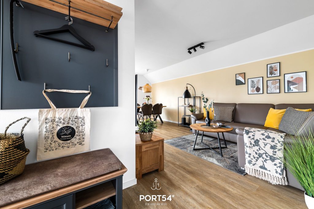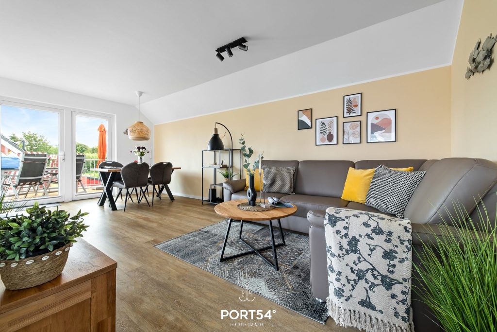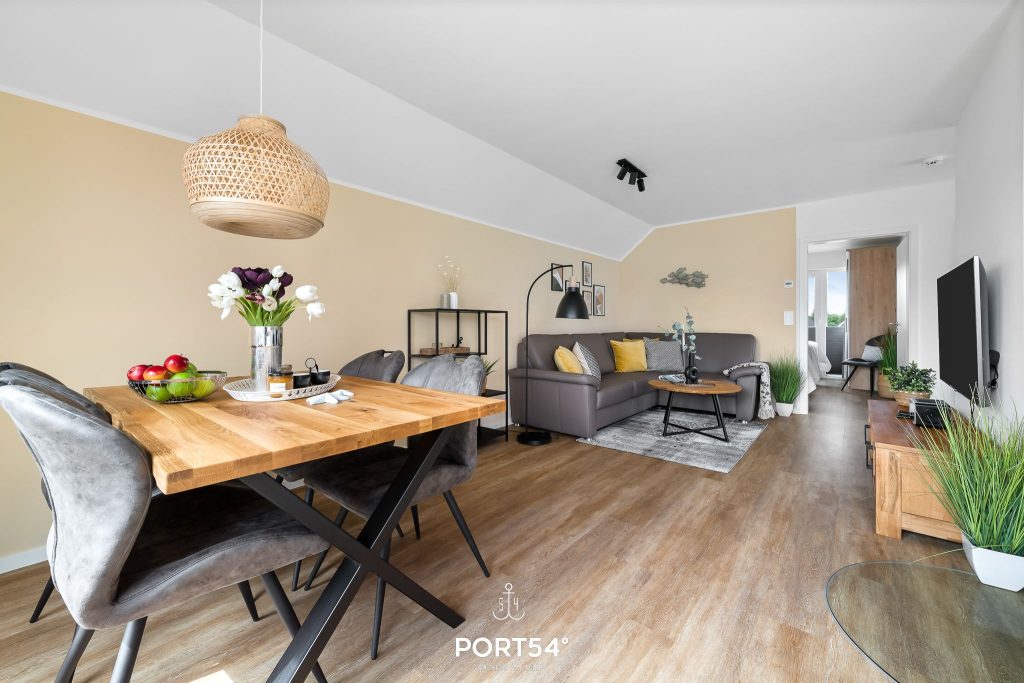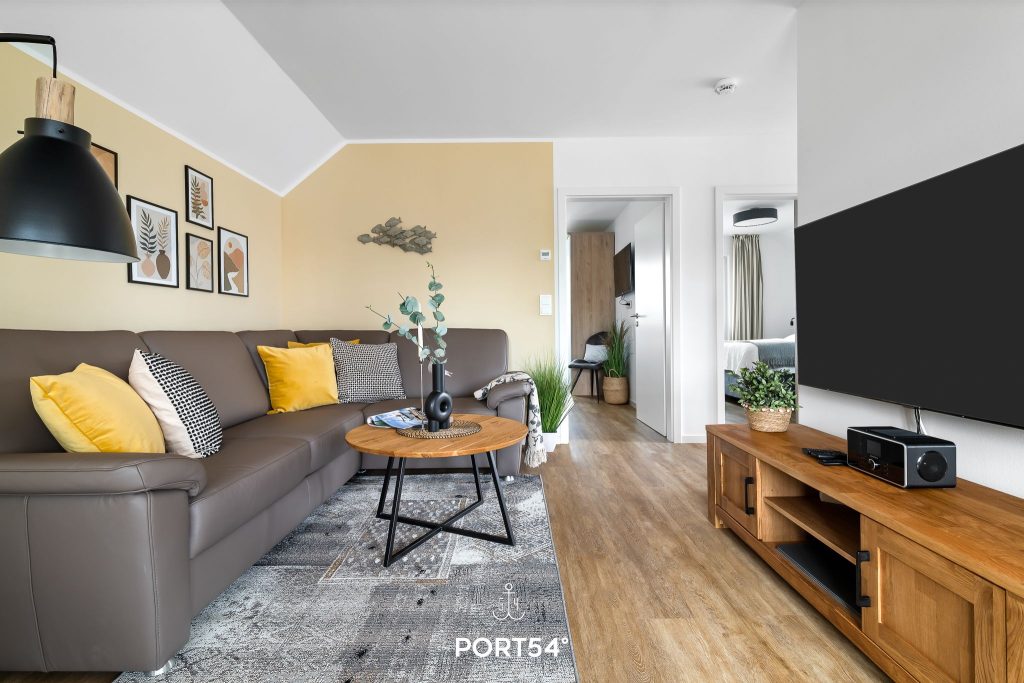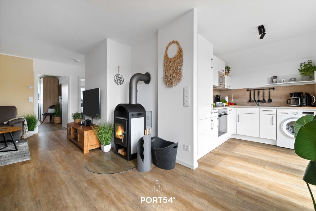 Schon beim Betreten überzeugt die Ferienwohnung mit ihrem offenen, lichtdurchfluteten Wohnkonzept. Die helle und freundliche Gestaltung schafft sofort eine entspannte Urlaubsatmosphäre, in der du dich vom ersten Moment an willkommen fühlst. Der moderne Wohnbereich lädt mit einem bequemen Ecksofa ein. Ein Smart-TV mit Magenta-TV, ein DAB-Radio, eine kleine Auswahl an Büchern sowie einige Gesellschaftsspiele sorgen für gemütliche und unterhaltsame Stunden.