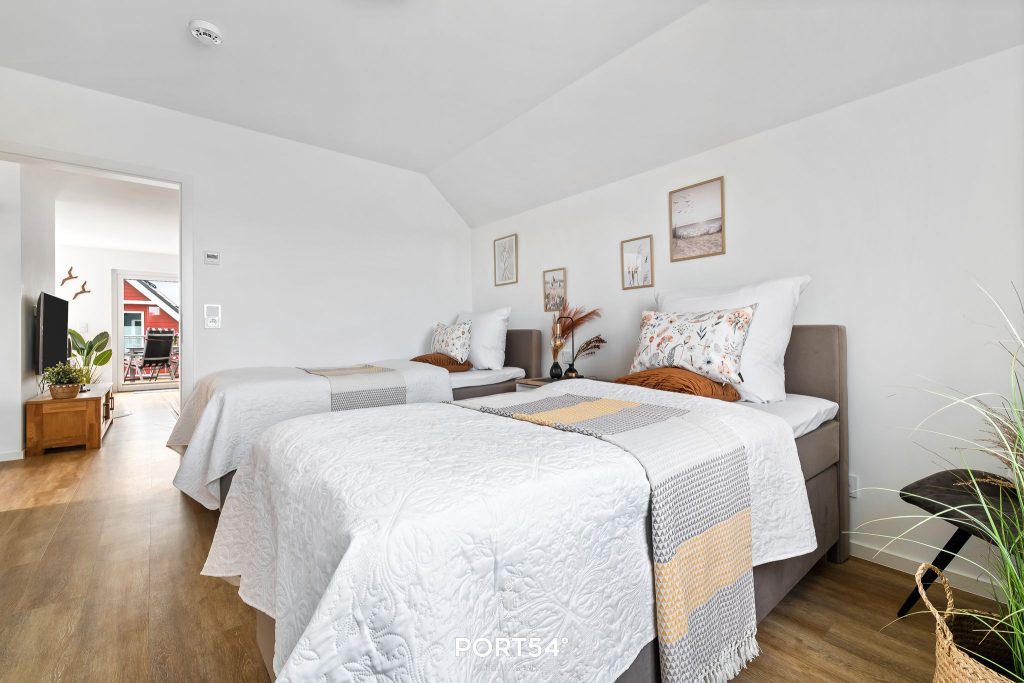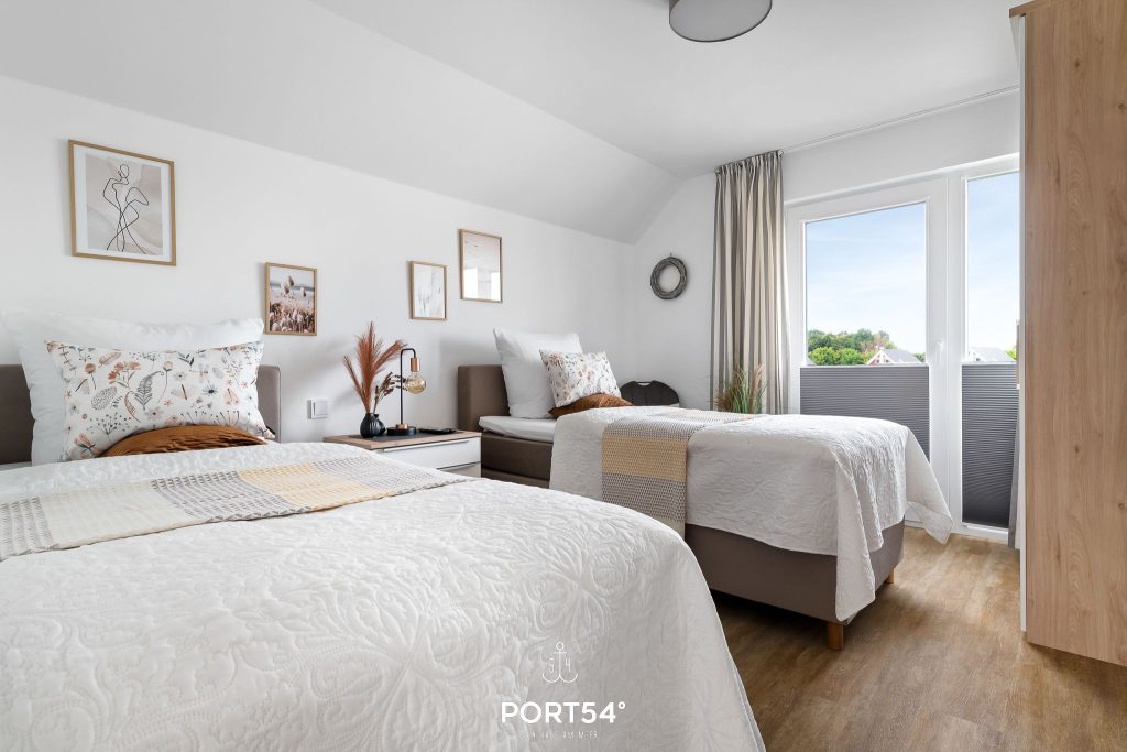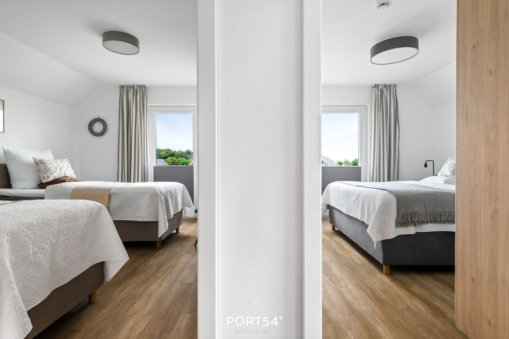 Die beiden Schlafzimmer sind mit hochwertigen Boxspringbetten ausgestattet und bieten dir beste Voraussetzungen für erholsame Nächte. Eines der Zimmer verfügt über ein Doppel-Boxspringbett (180 x 200 cm), das andere über zwei Einzel-Boxspringbetten (90 x 200 cm). In beiden Schlafzimmern findest du Verdunkelungsplissees, Insektenschutz vor den Fenstern, einen Smart-TV mit Magenta-TV sowie einen Kleiderschrank mit Spiegel. So hast du angenehme Rückzugsorte, in denen du Ruhe, Komfort und erholsamen Schlaf genießen kannst.